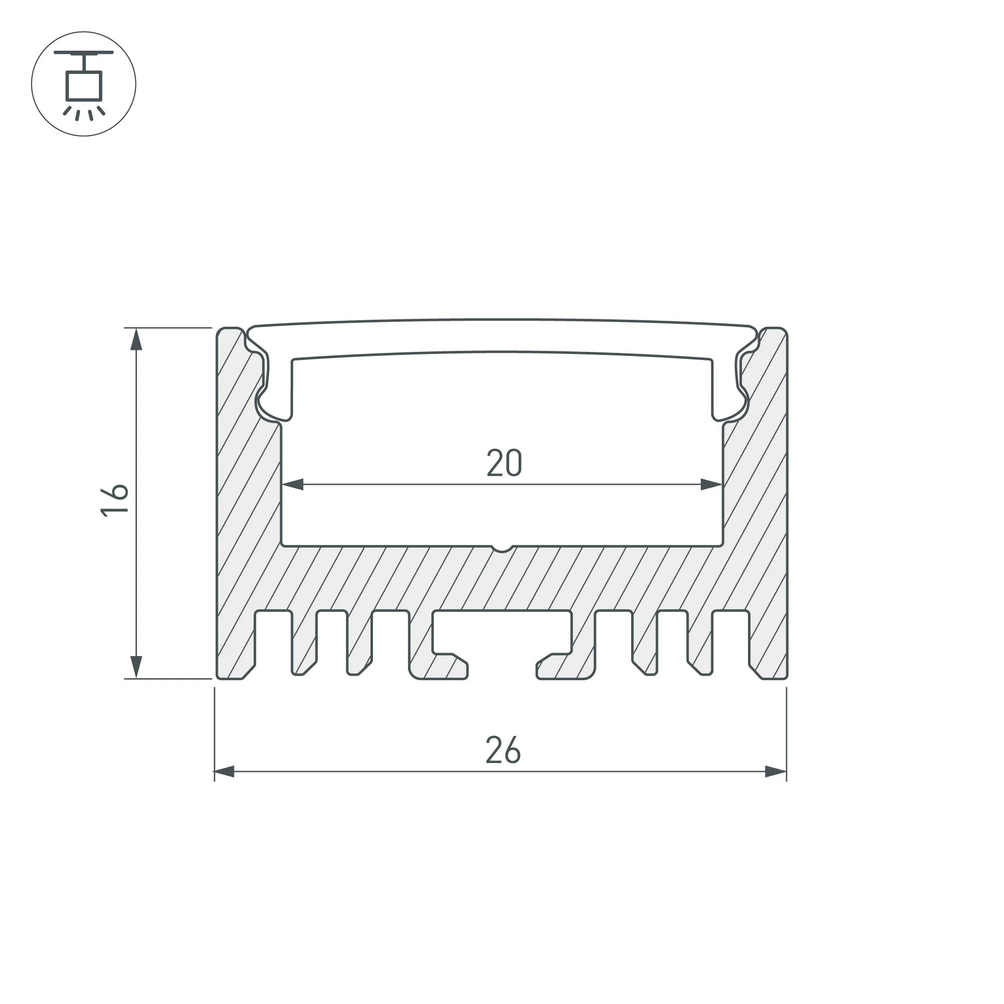 Алюминиевый анодированный подвесной профиль для светодиодных лент и линеек. Габаритные размеры (L×W×H): 2000x26x16 мм. Ширина площадки для ленты 20 мм. Экраны, заглушки и другие аксессуары приобретаются отдельно. Цена за 1 метр. Кратность заказа поставщику: 2 м.