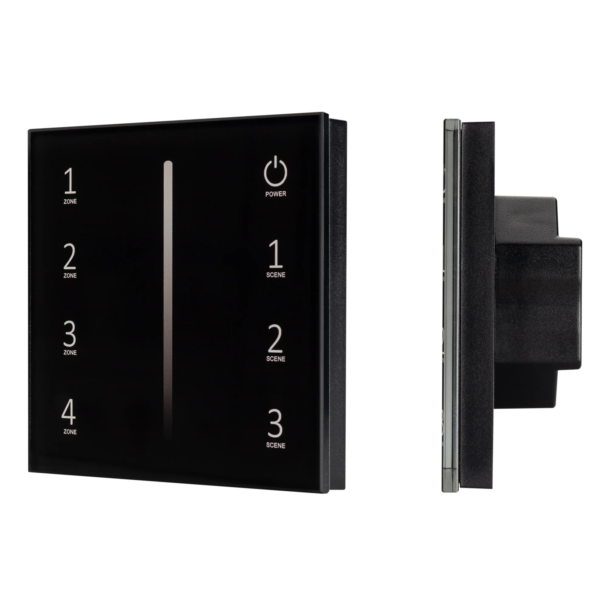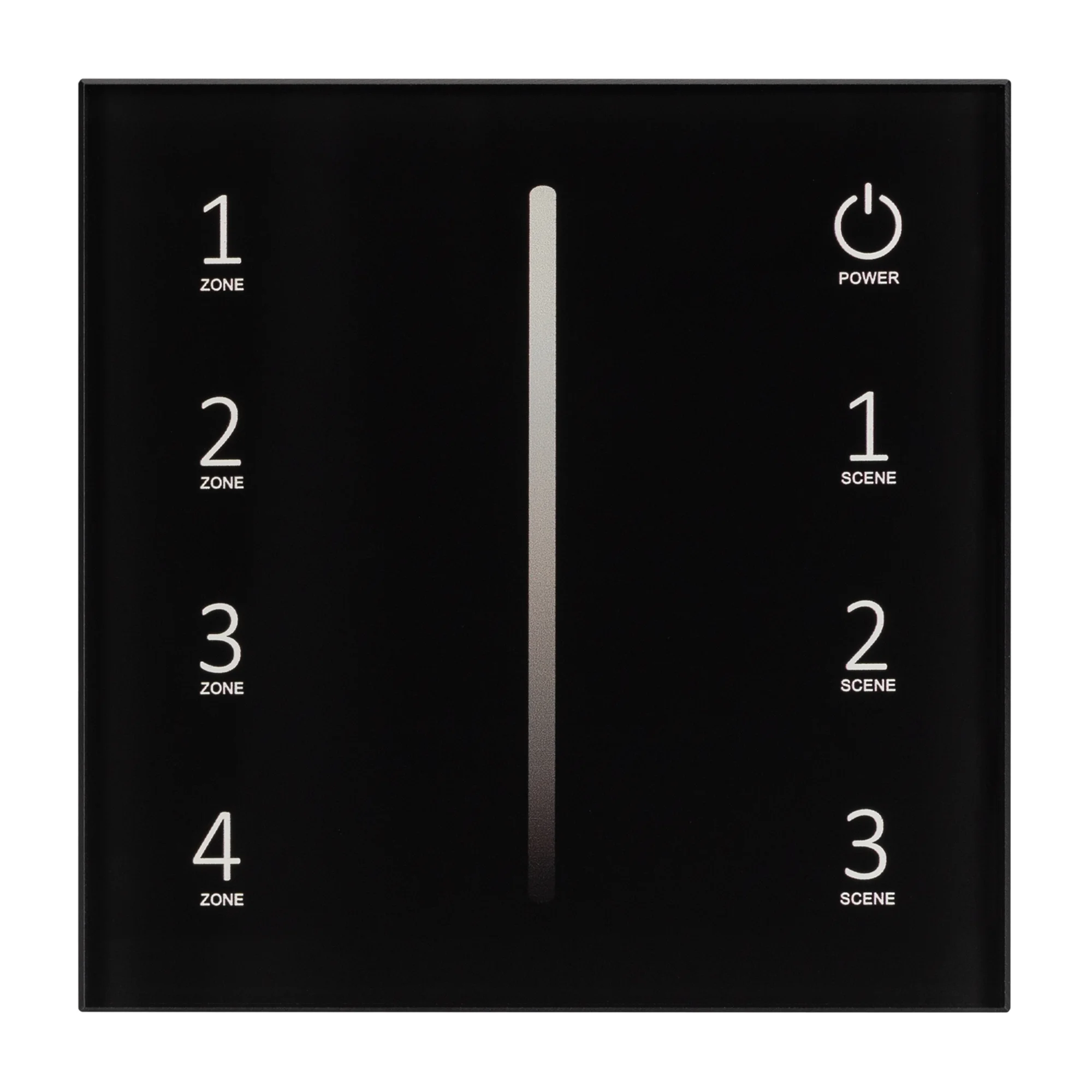 Встраиваемая сенсорная панель, цвет чёрный. Материал — стекло. Выходной сигнал 0/1-10V. Управление яркостью с сенсорной полосы. 4 зоны управления. Питание 230V, входное напряжение 86-265VAC. Габариты 86х86х35 мм. Панель совместима с 0/1-10V диммерами.