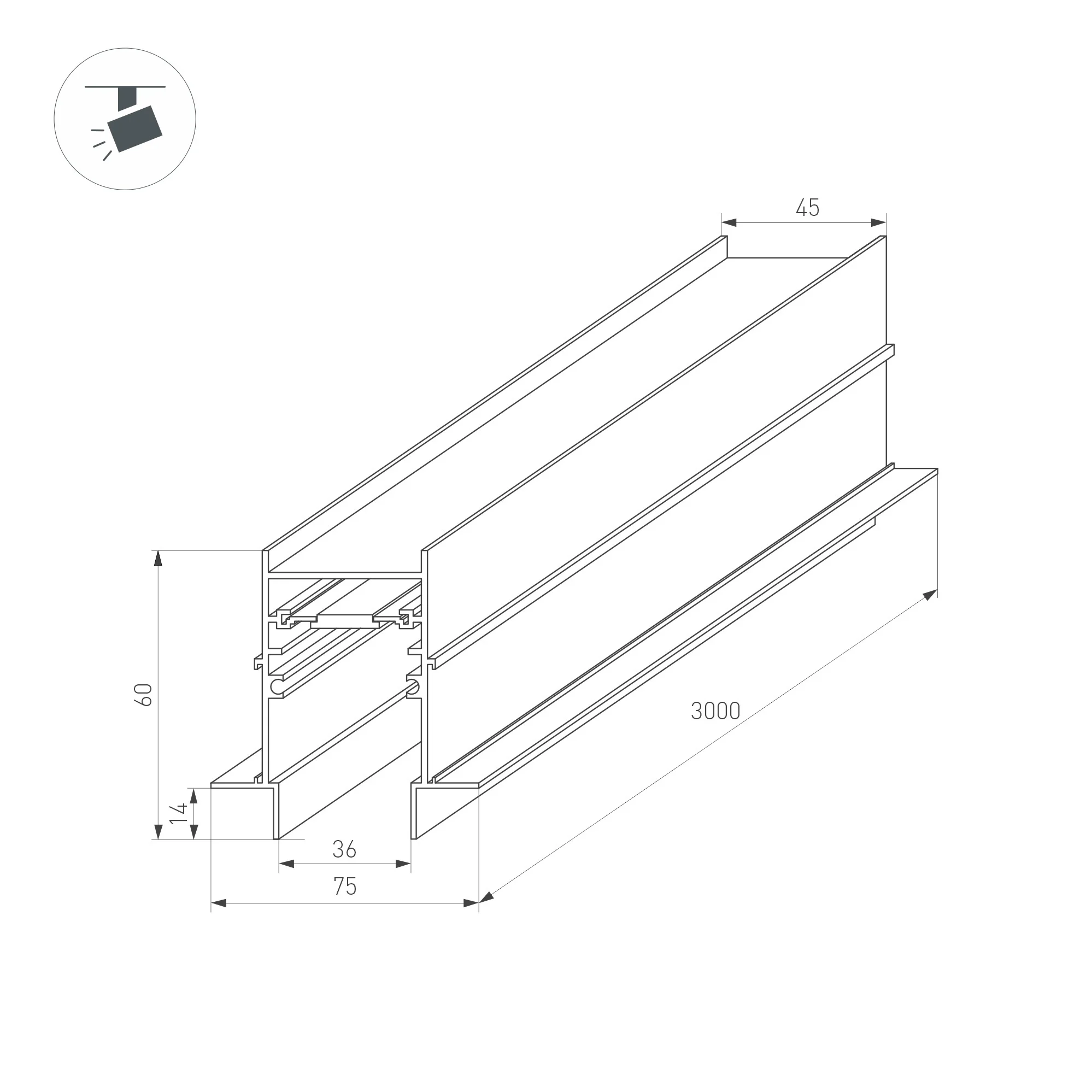 Встраиваемый магнитный трек с фланцем для монтажа в гипсокартонный потолок, длина 3000 мм. DC24V. Материал алюминий, цвет черный. Две заглушки в комплекте. Размер ДxШxВ: 3000x75x60 мм. Размер (с учетом заглушек и фланцев) ДxШxВ: 3040x75x60 мм. DC24V.