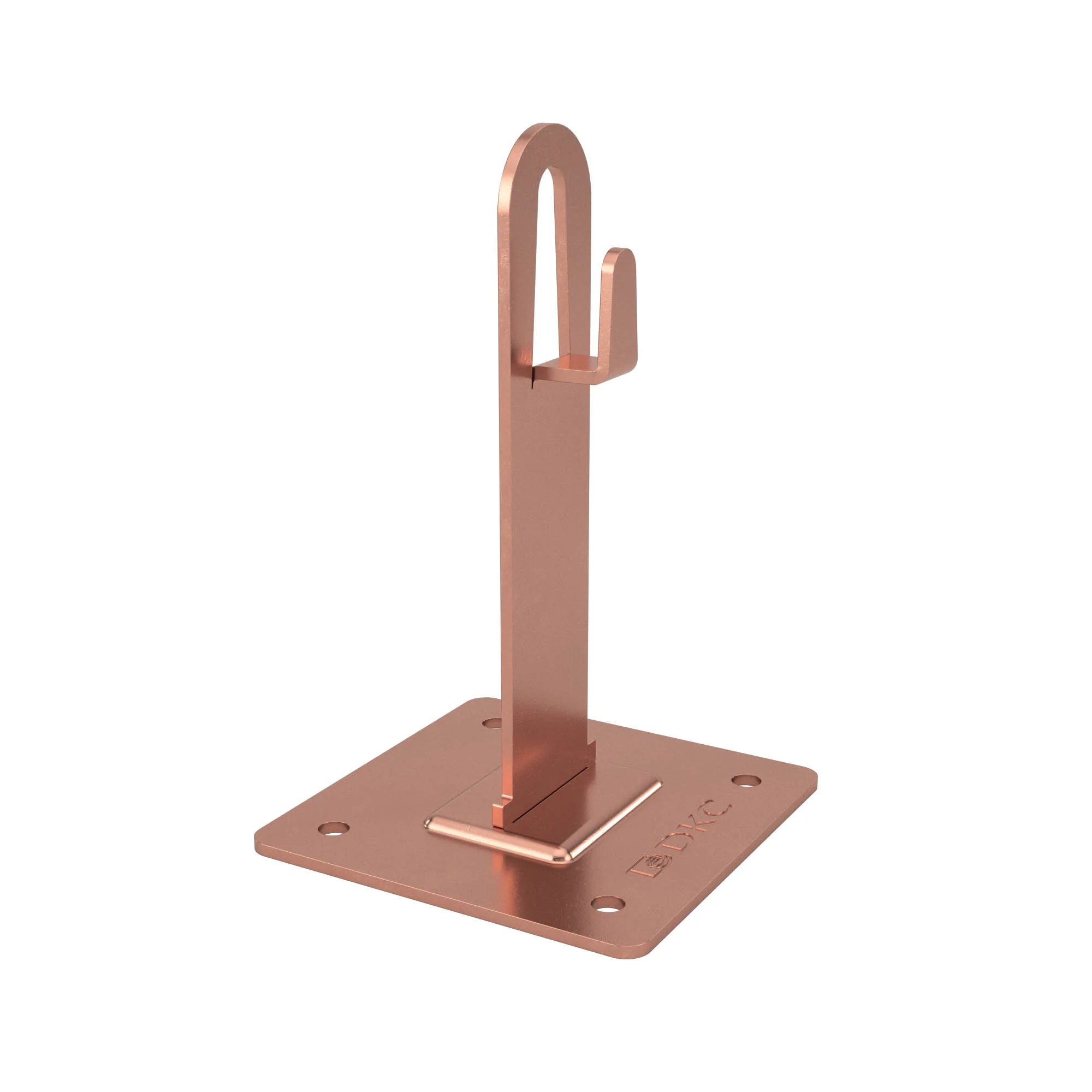 Металлический держатель используется для фиксации молниеприемной сетки на основе прутка диаметром 8-10 мм на плоской либо скатной кровле при помощи саморезов. Проводник крепится безвинтовым зажимом с применением плоскогубцев. Материал — медь, высота — 150 мм.