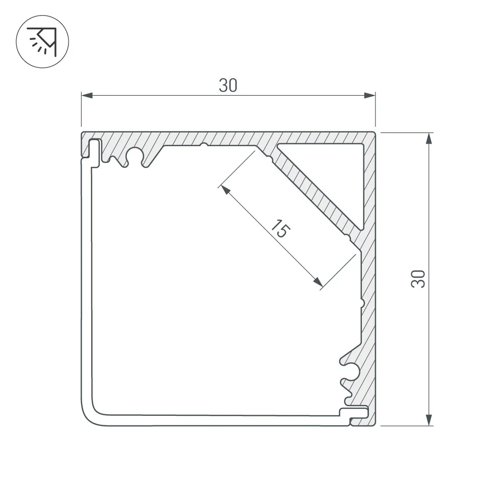 Алюминиевый анодированный угловой профиль для светодиодных лент и линеек. Габаритные размеры (L×W×H): 3000x30x30 мм. Ширина площадки для ленты 15 мм. Экраны, заглушки и другие аксессуары приобретаются отдельно. Цена за 1 метр. Кратность заказа поставщику: 3 м.