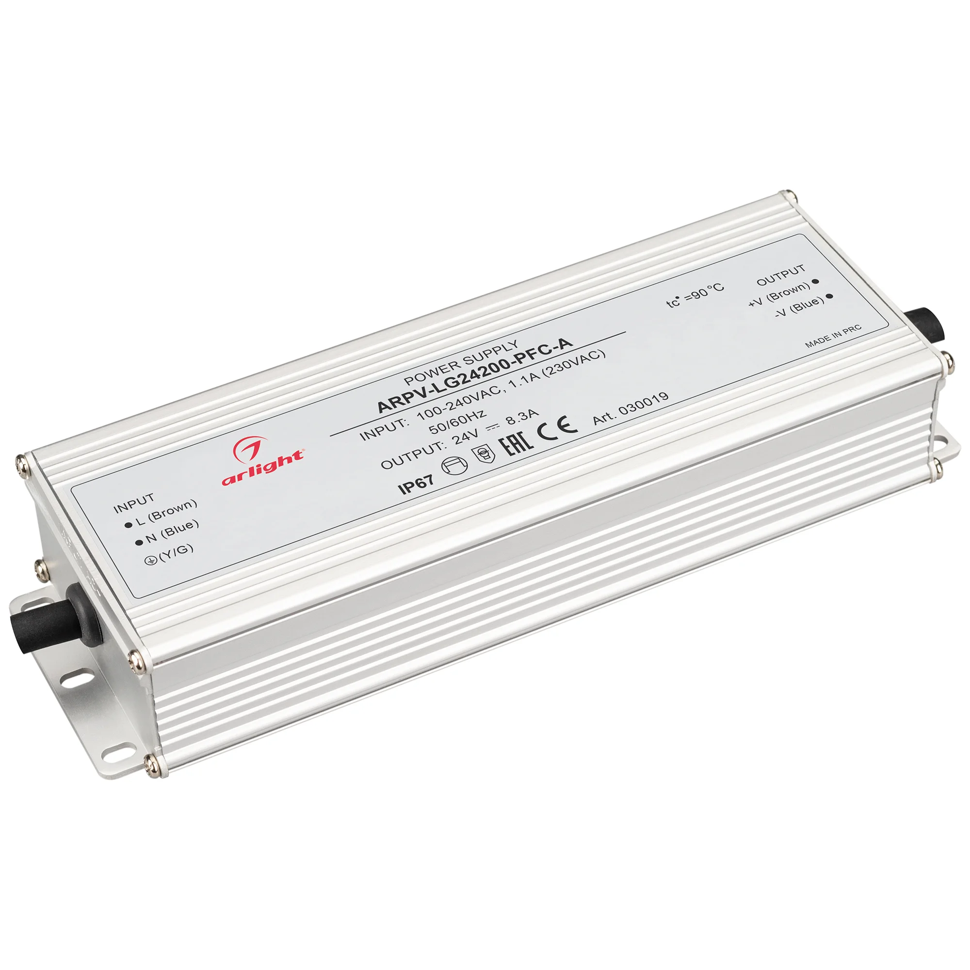 Источник напряжения с гальванической развязкой для светодиодных изделий. Входное напряжение 100-240 VAC. Выходные параметры: 24 В, 8.3 А, 200 Вт. Встроенный PFC >0.98. Герметичный алюминиевый корпус IP 67. Рабочая температура -40…+70C°. Габаритные размеры длина 199 мм, ширина 67.5 мм, высота 35.5 мм. Гарантийный срок 5 лет.