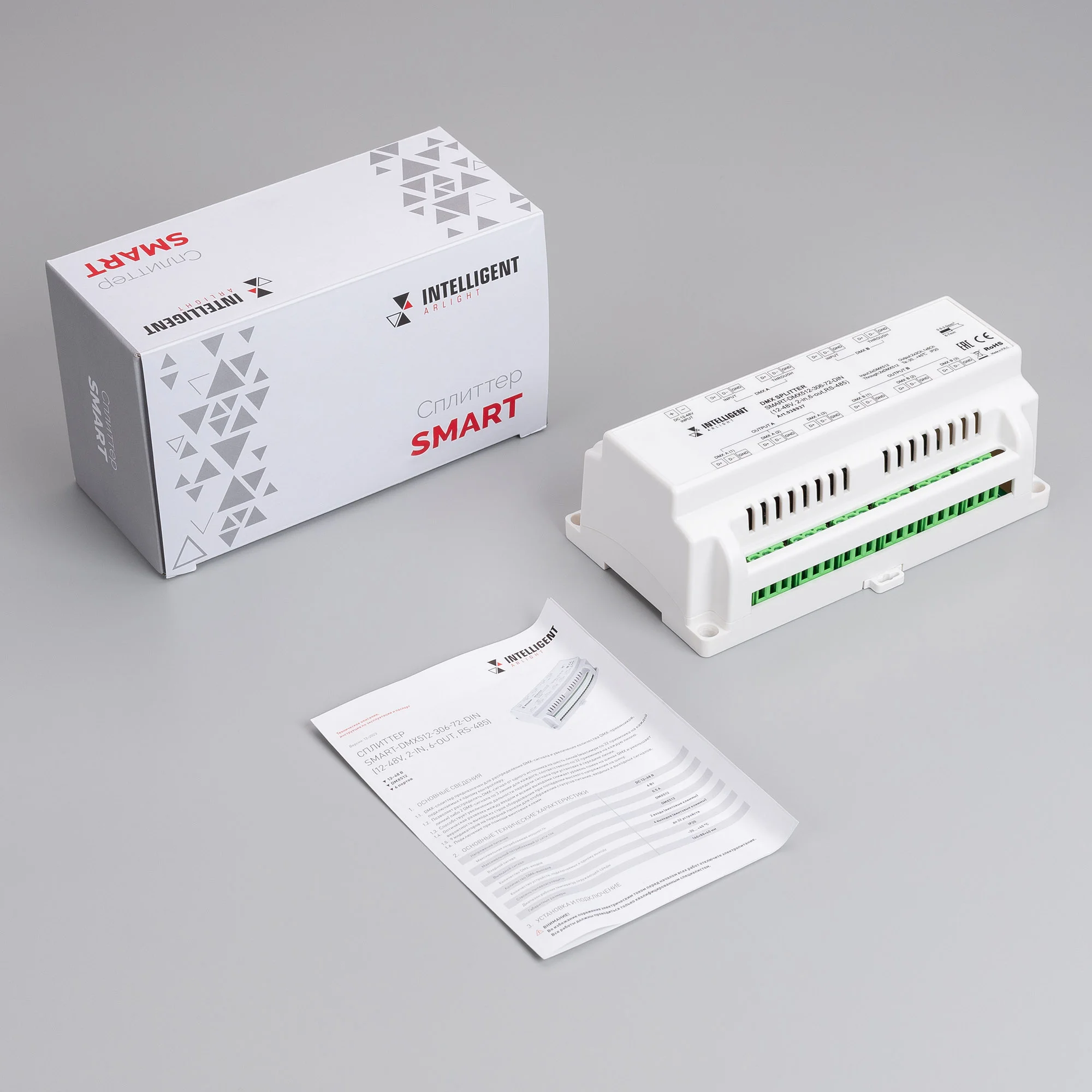 Сплиттер (усилитель) DMX512 сигнала. Вход — 2 порта DMX512, выход — 6 портов DMX512. Напряжение питания DC 12-48V, разъемы RS-485 (терминальные клеммы). Габариты 160х88х60 мм.