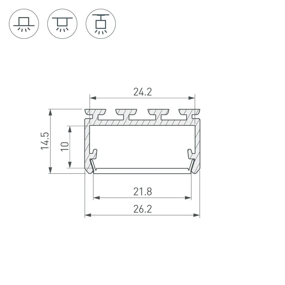 Алюминиевый анодированный профиль для светодиодных лент и линеек. Габаритные размеры (L×W×H): 3000×26,2×14,5 мм. Ширина площадки для ленты 24,2 мм. Экраны, заглушки и другие аксессуары приобретаются отдельно. Цена за 1 метр. Кратность заказа поставщику: 3 м.