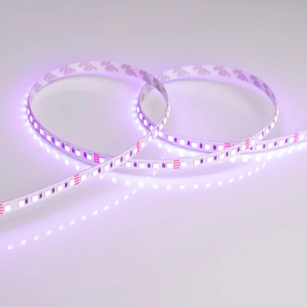 Мультицветная лента серии RT G120. Светодиоды SMD 3838, 120 шт/м, белая плата шириной 8 мм, скотч 3M. Цвет RGB. Питание 24 В, мощность 11 Вт/м (55 Вт на 5 м), угол 120°. Размеры 5000x8x1.9 мм. Мин. отрезок 50 мм, 6 светодиодов. Цена за 1 м. Кратность заказа поставщику: 5 м.