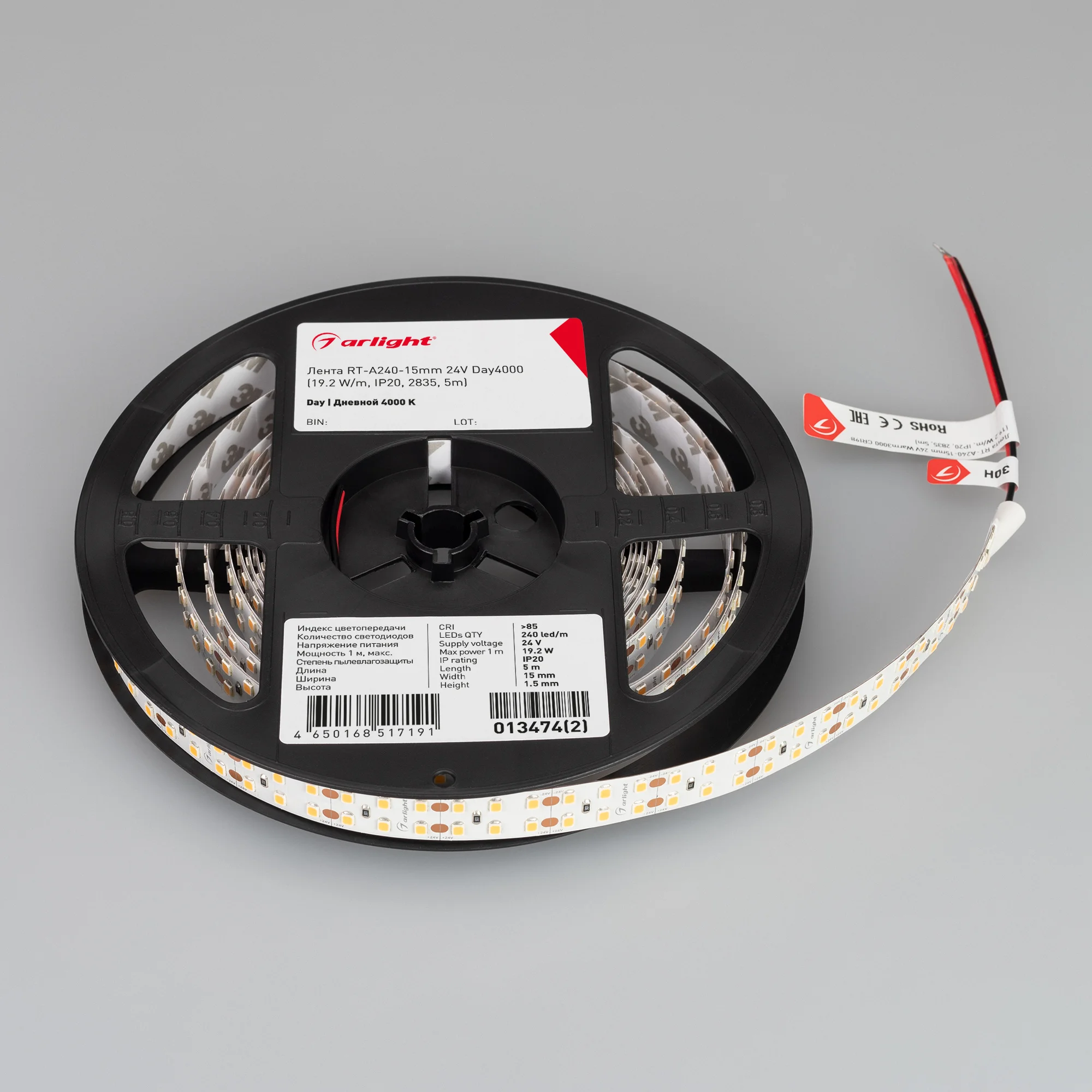 Светодиодная широкая лента RT серии A240. Светодиоды 2835, 240 шт/м, белая плата шириной 15 мм, скотч 3M. Цвет ДНЕВНОЙ 4000K, индекс цветопередачи CRI>85, угол 120°. Питание 24 В, мощность 19.2 Вт/м (96 Вт на 5 м). Размеры 5000х15х1.5 мм. Мин. отрезок 25 мм, 6 светодиодов. Цена за 1 м. Кратность заказа поставщику: 5 м.