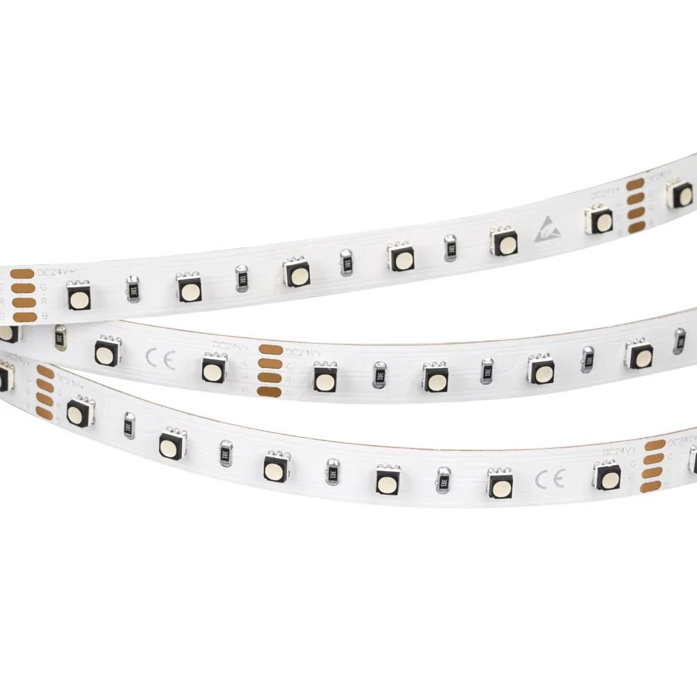 Мультицветная светодиодная лента MINI серии F60. Светодиоды SMD 3535, 60 шт/м, белая плата шириной 10 мм, скотч 3M. Цвет RGB, угол 120°. Питание 24 В, мощность 14.4 Вт/м (72 Вт на 5 м). Размеры 5000x10x3.1 мм. Мин. отрезок 100 мм, 6 светодиодов. Цена за 1 м. Кратность заказа поставщику: 5 м.