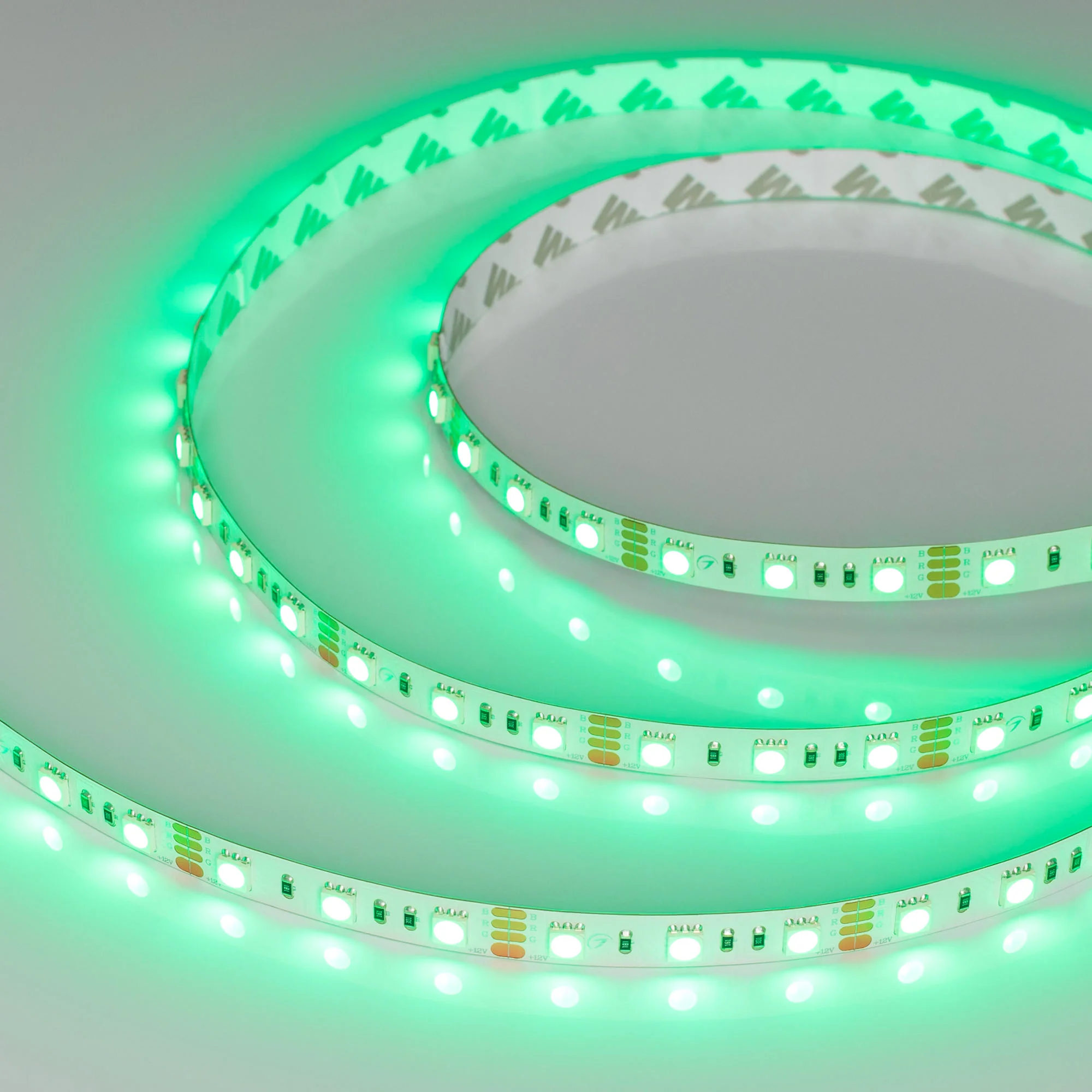 Мультицветная светодиодная лента RT серии B60. Светодиоды SMD 5060, 60 шт/м, белая плата шириной 10мм, скотч 3M. Цвет RGB, угол 120°. Питание 12 В, мощность 14.4 Вт/м (72 Вт на 5 м). Размеры 5000x10x2.2 мм. Мин. отрезок 50 мм, 3 светодиода. Цена за 1 м. Кратность заказа поставщику: 5 м.