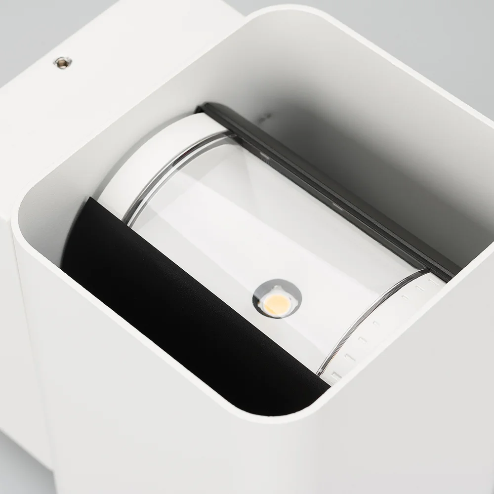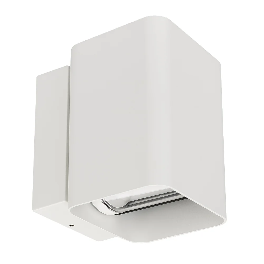 Уличный светодиодный светильник для стен, изменяемый угол освещения 0°-80°, свет вверх-вниз на 2 стороны. Цвет ТЕПЛЫЙ БЕЛЫЙ 3000К, светодиоды 2×6Вт CREE (750 лм). Влагозащищенный корпус IP54 — белый (RAL9003) алюминий, экран ударопрочный PC. Питание 230В, мощность 12 Вт. Размеры ВхШхГ -138х104х129 мм.