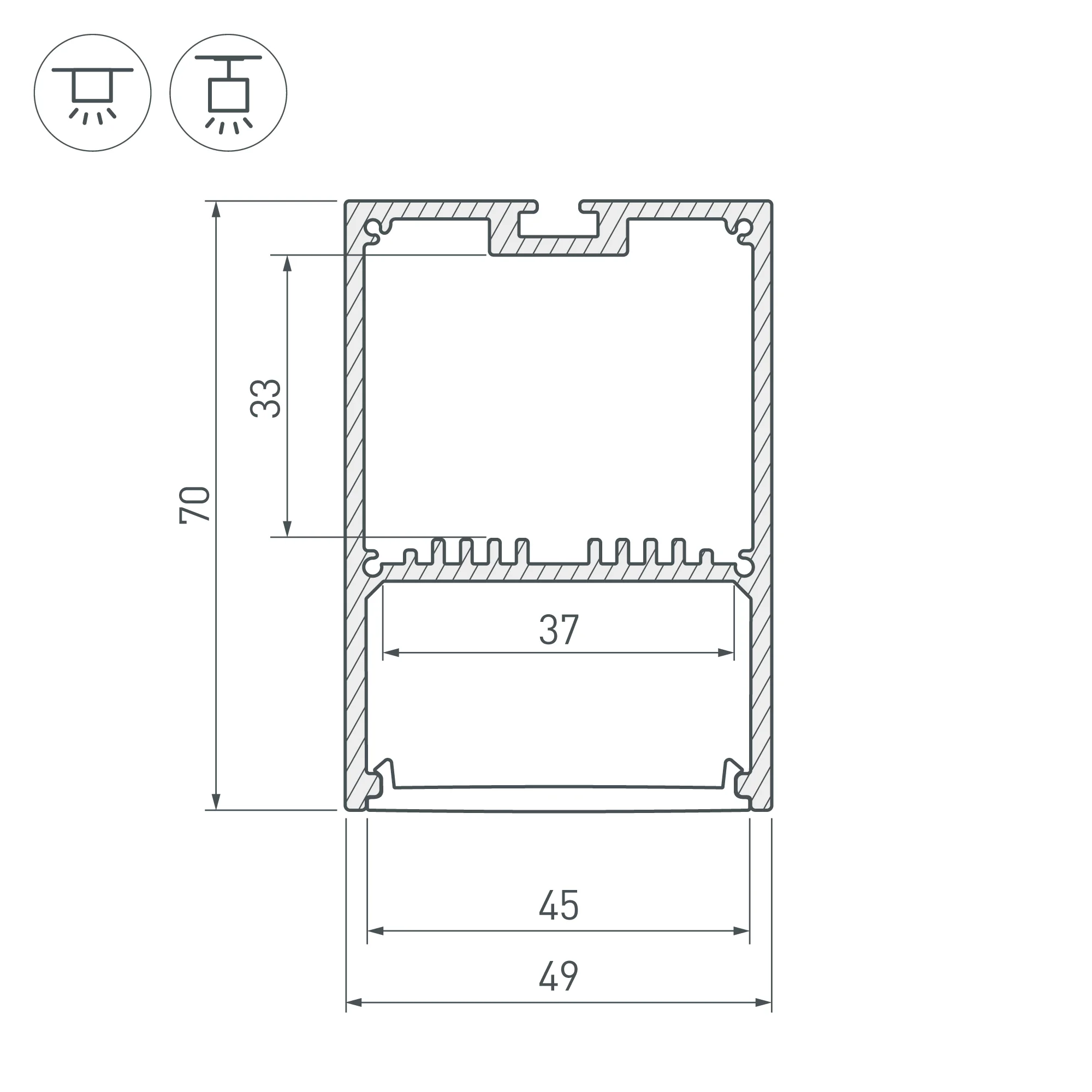 Алюминиевый анодированный профиль для светодиодных лент и линеек. Габаритные размеры (L×W×H): 2000x49x70 мм. Ширина площадки для ленты 37 мм. Отсек для БП 33х45мм. Экраны, заглушки и другие аксессуары приобретаются отдельно. Цена за 1 метр. Кратность заказа поставщику: 2 м.
