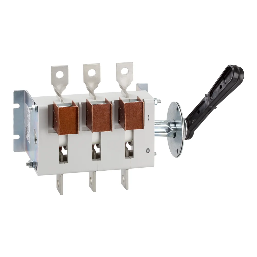 Выключатель-разъединитель 3 полюсный на номинальный ток 400 А, в котором установлена передняя смещенная несъемная рукоятка.