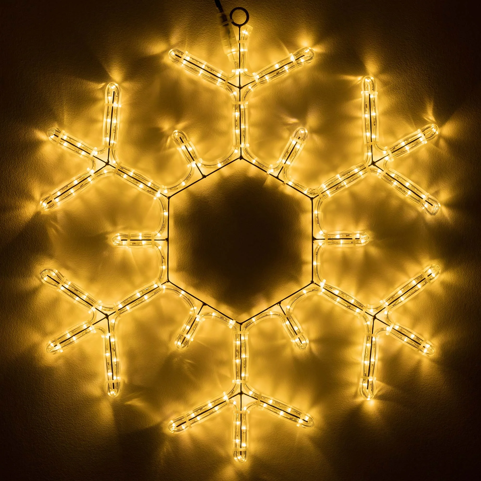 Светодиодная фигура СНЕЖИНКА. Размер 600×600 мм. Цвет светодиодов ТЕПЛЫЙ БЕЛЫЙ (3000 К), постоянное свечение. 360 светодиодов. Напряжение питания 230 В, потребляемая мощность 20 Вт, степень пылевлагозащиты IP65. Фигура укомплектована проводом питания для подключения к сети 230 В (без вилки питания).