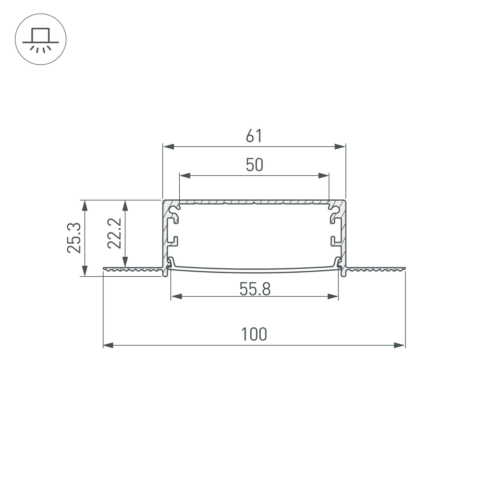 Алюминиевый анодированный профиль для встраивания в гипсокартон. Габаритные размеры (L×W×H): 3000x100x25,3 мм, паз для установки 60х22,5 мм. Ширина площадки для ленты — 50 мм. Экраны и заглушки приобретаются отдельно. Цена за 1 метр. Кратность заказа поставщику: 3 м.