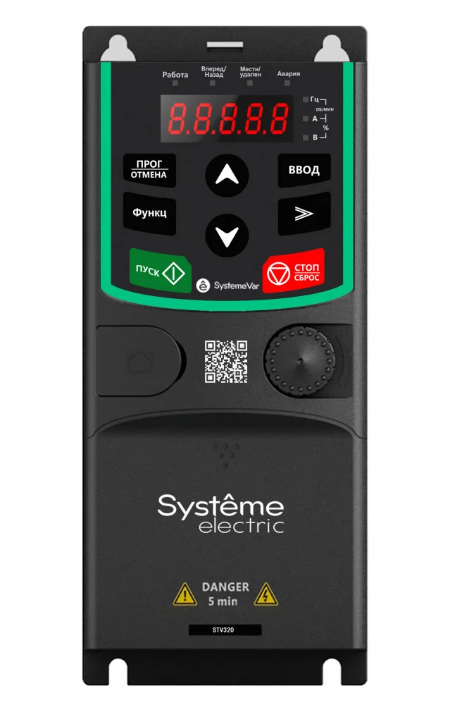 Преобразователь частоты SystemeVar 320 (STV320). Номинальная мощность: 1,5 кВт (G-тип: перегрузочная способность: 150% в течение 60с, 180% в течение 10с, 200% в течение 1с. Несущая частота ШИМ: 8 кГц). Номинальный ток: 4,2 А (G-тип). Питающее напряжение 3Ф 380В (-15%) ~ 440В (+10%). Степень защиты IP20. Габаритные размеры (ДхШхВ), мм: 80х140,5х185. Вес: 1 кг.