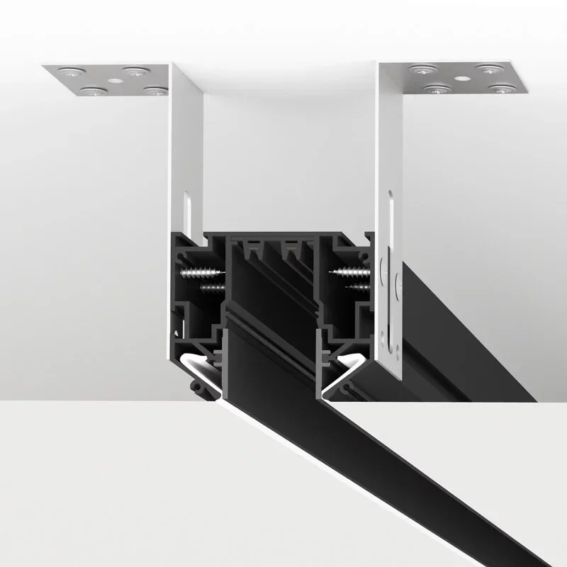Встраиваемый магнитный трек ORIENT с фланцем, длина 2000мм. DC48V. Материал алюминий, цвет черный. Заглушки в комплект не входят. Размер ДxШxВ: 2000×26.2×52.2мм. Размер (с учетом заглушек и фланцев) ДxШxВ: 2005x70x52.2мм. Подходит под ГКЛ <12мм.