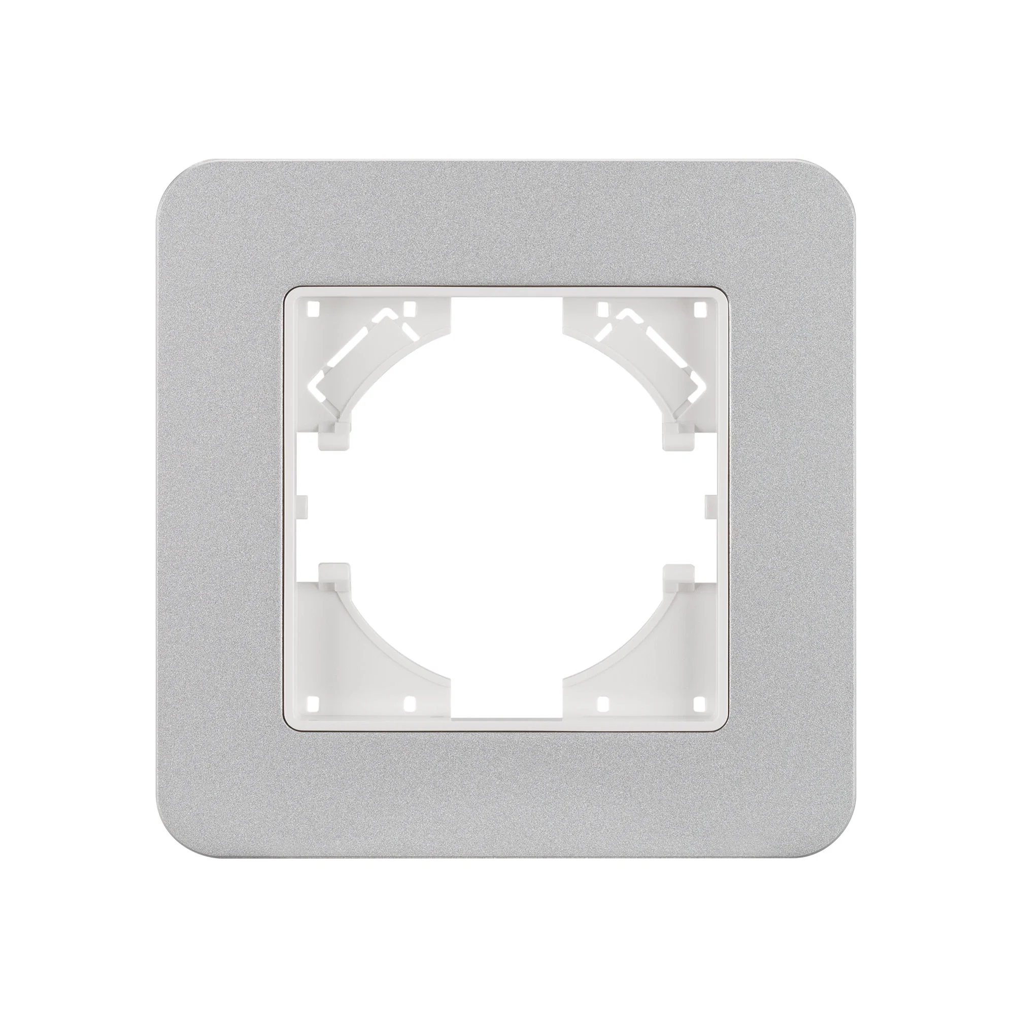 Рамка алюминиевая на 1 пост, под встраиваемый механизм. Цвет — серебристый с Soft-Touch покрытием. Среднего уровня герметичности IP20. Ориентация монтажа — горизонтальная (основным ориентиром служат посадочные выступы для накладки механизма). Габаритные размеры: длина 86 мм, ширина 86 мм, высота 7 мм. Гарантийный срок 12 мес.