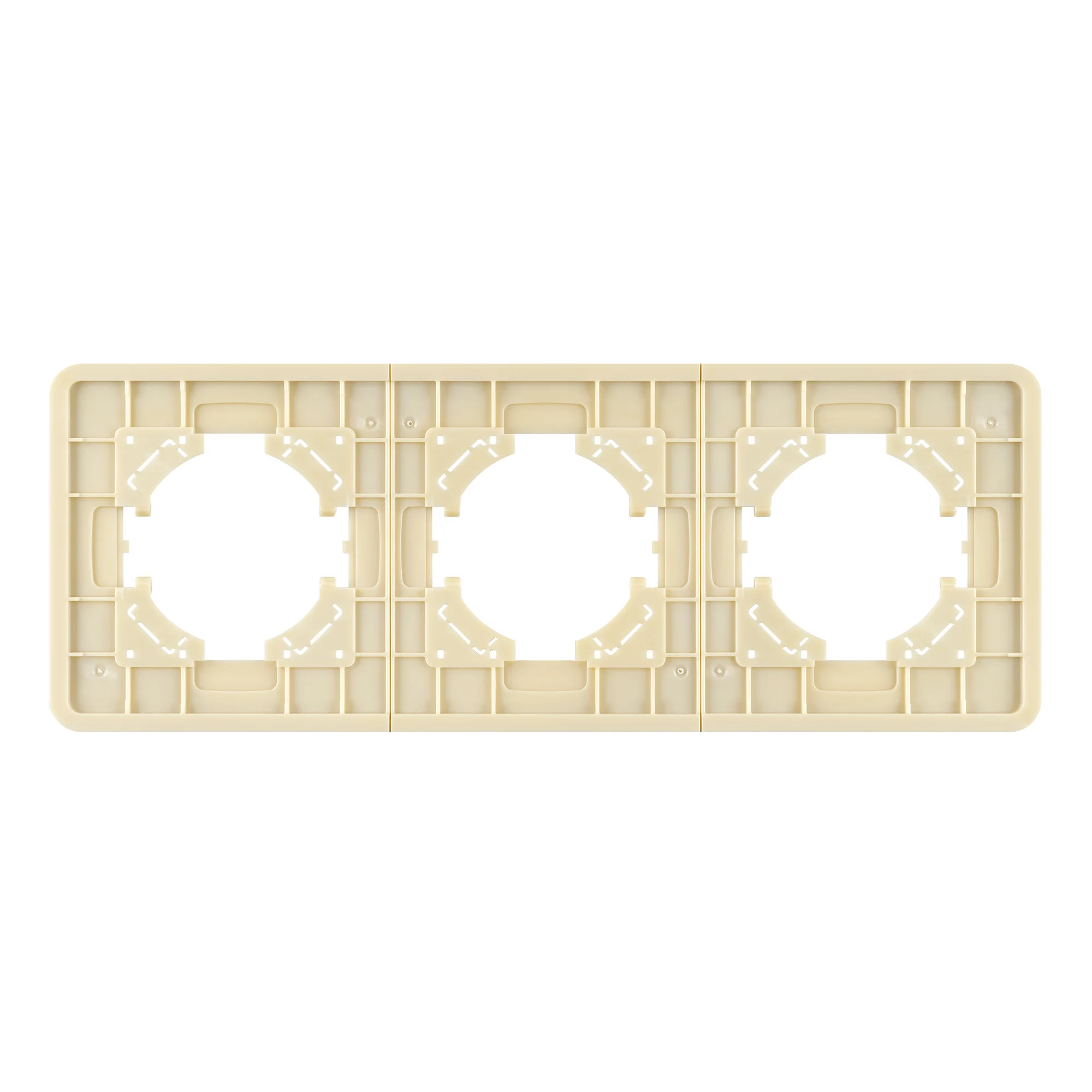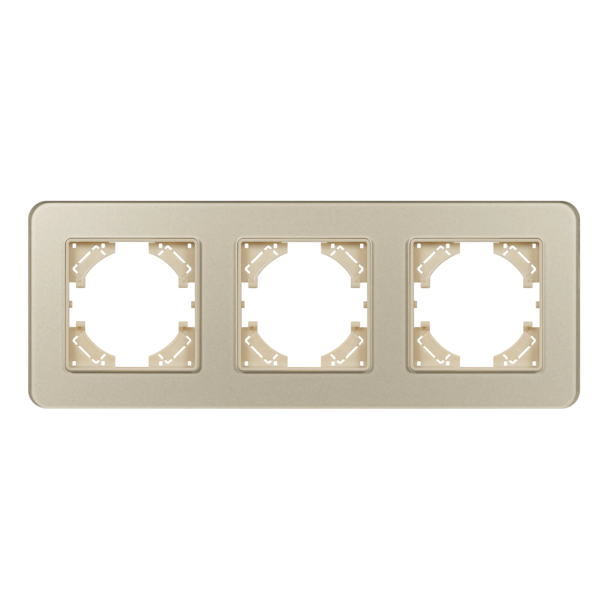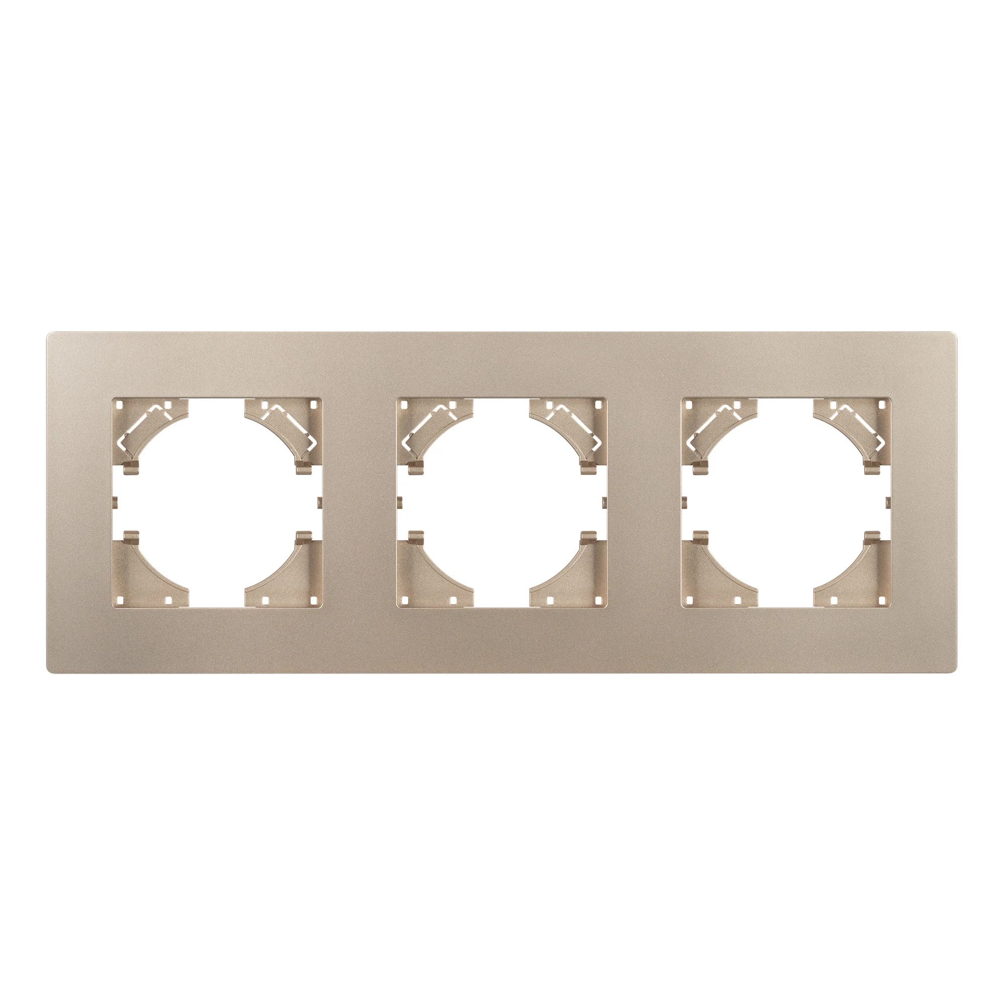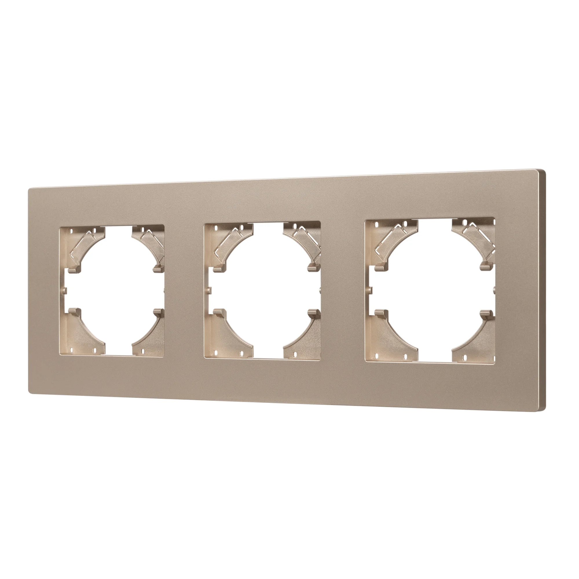Рамка пластиковая на 3 поста, под встраиваемый механизм. Цвет — золотой. Среднего уровня герметичности IP20. Ориентация монтажа — горизонтальная (основным ориентиром служат посадочные выступы для накладки механизма). Габаритные размеры: длина 228 мм, ширина 86 мм, высота 7 мм. Гарантийный срок 12 мес.