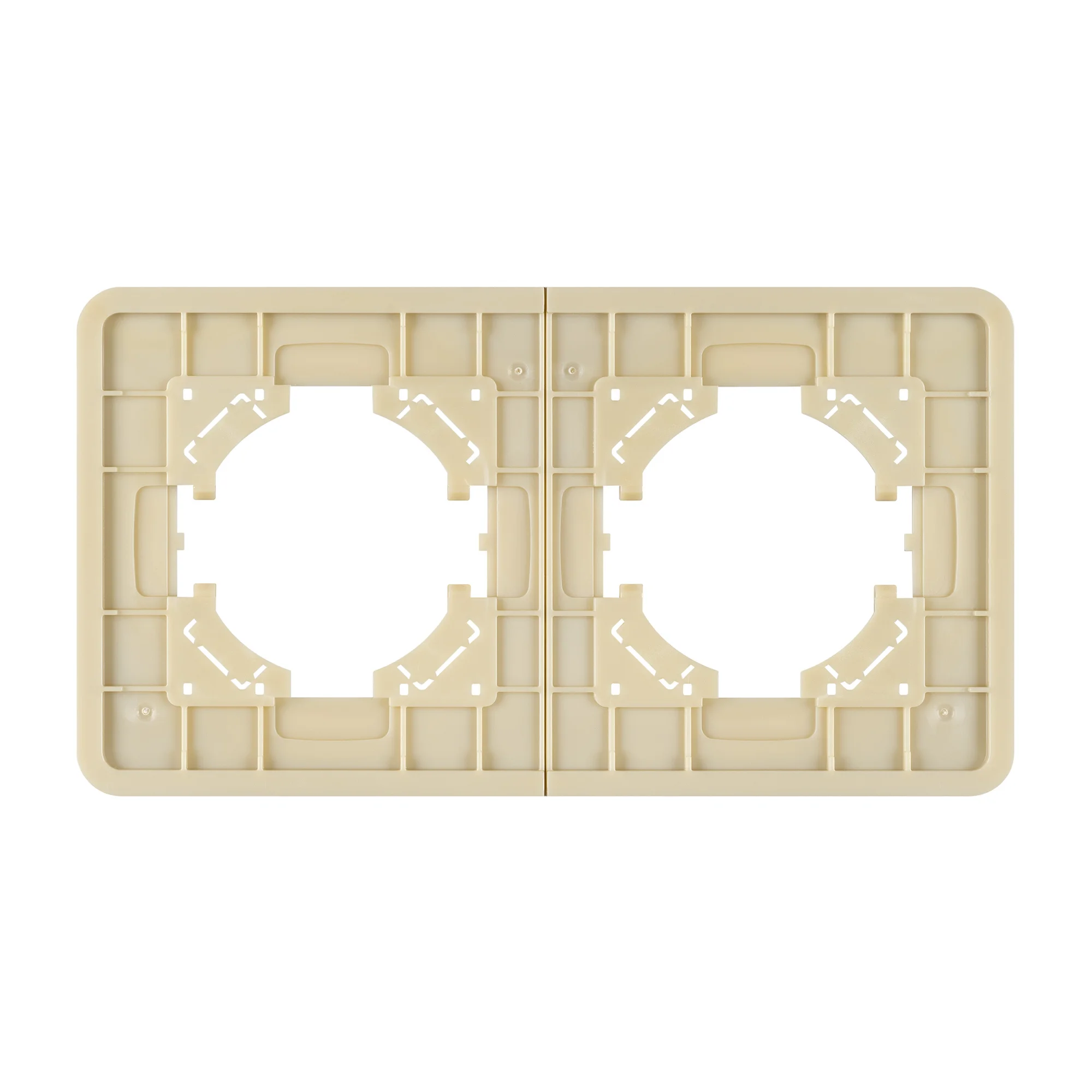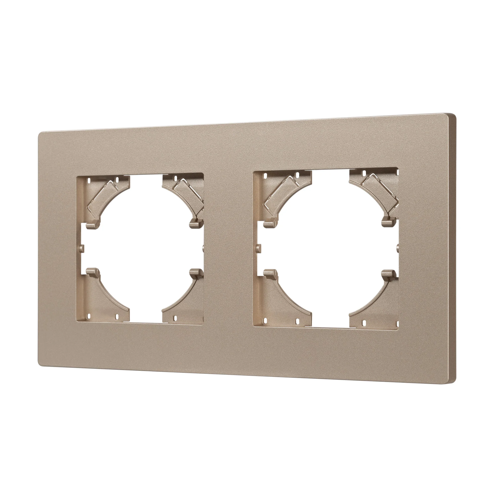 Рамка пластиковая на 2 поста, под встраиваемый механизм. Цвет — золотой. Среднего уровня герметичности IP20. Ориентация монтажа — горизонтальная (основным ориентиром служат посадочные выступы для накладки механизма). Габаритные размеры: длина 157 мм, ширина 86 мм, высота 7 мм. Гарантийный срок 12 мес.