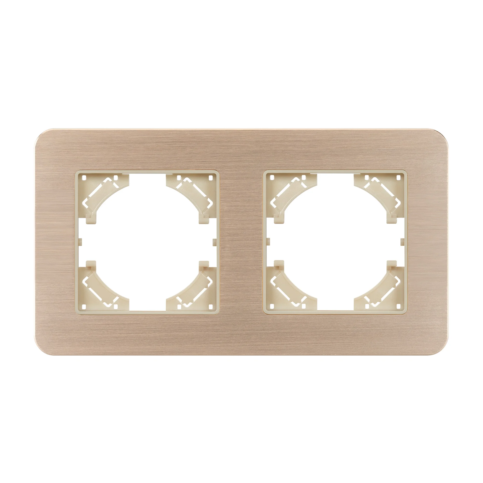 Рамка алюминиевая на 2 поста, под встраиваемый механизм. Цвет — золотой. Среднего уровня герметичности IP20. Ориентация монтажа — горизонтальная (основным ориентиром служат посадочные выступы для накладки механизма). Габаритные размеры: длина 157 мм, ширина 86 мм, высота 7 мм. Гарантийный срок 12 мес.