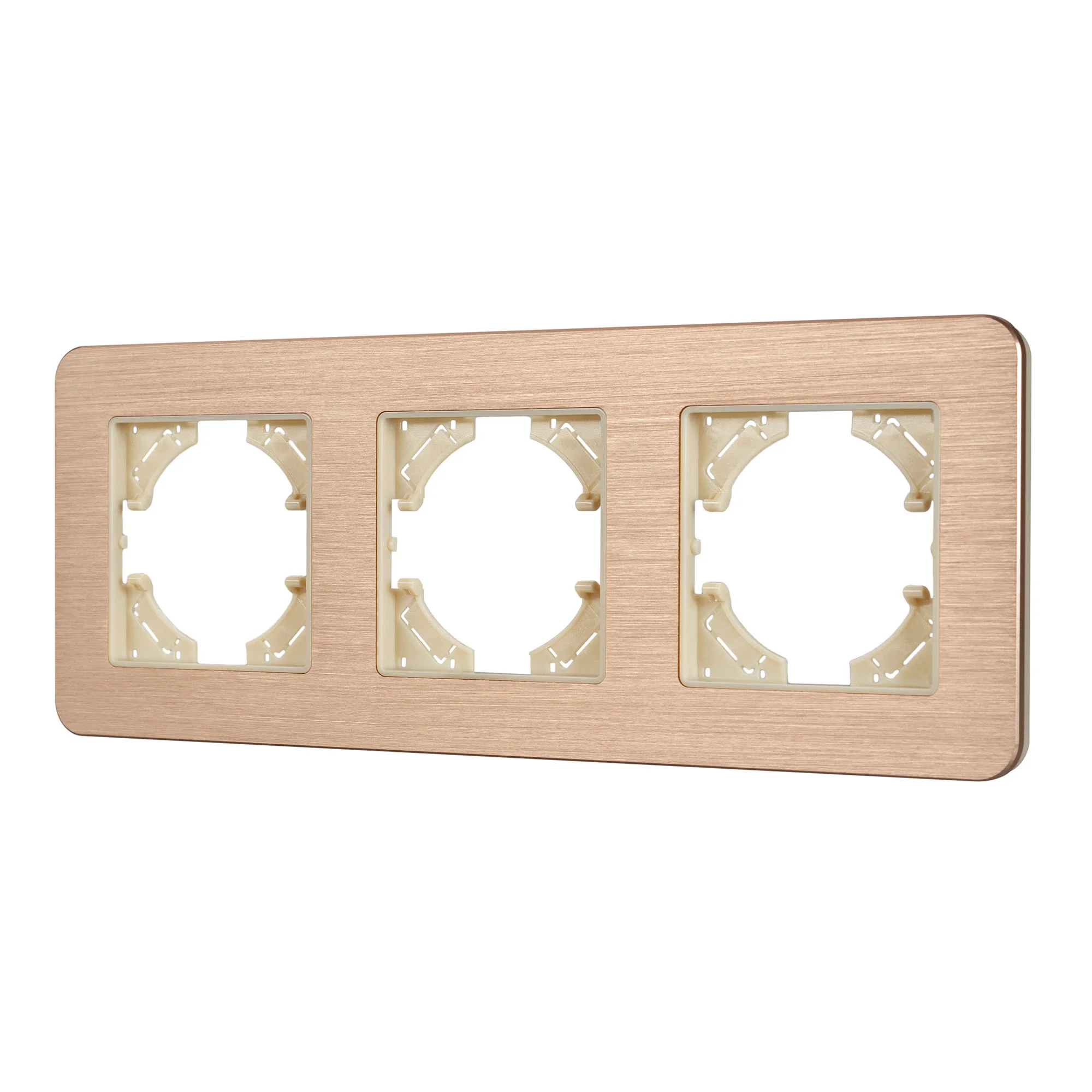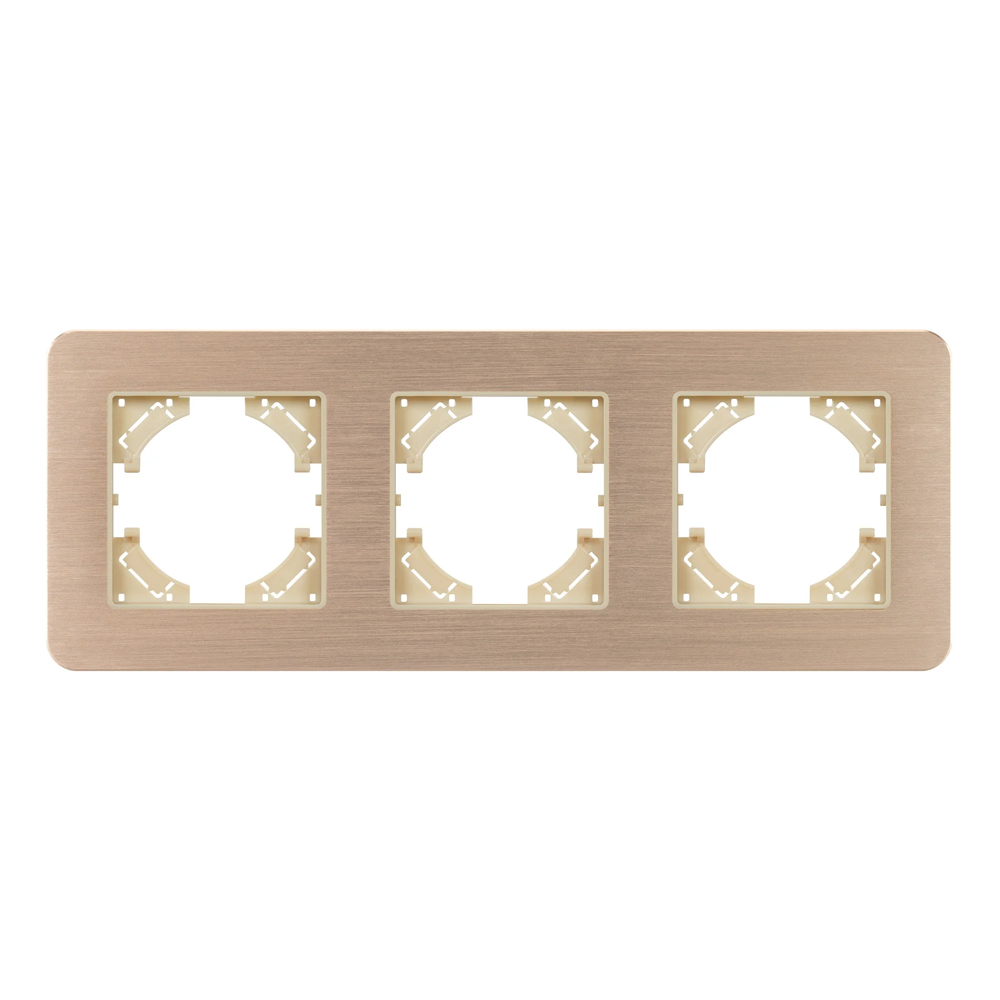 Рамка алюминиевая на 3 поста, под встраиваемый механизм. Цвет — золотой. Среднего уровня герметичности IP20. Ориентация монтажа — горизонтальная (основным ориентиром служат посадочные выступы для накладки механизма). Габаритные размеры: длина 228 мм, ширина 86 мм, высота 7 мм. Гарантийный срок 12 мес.