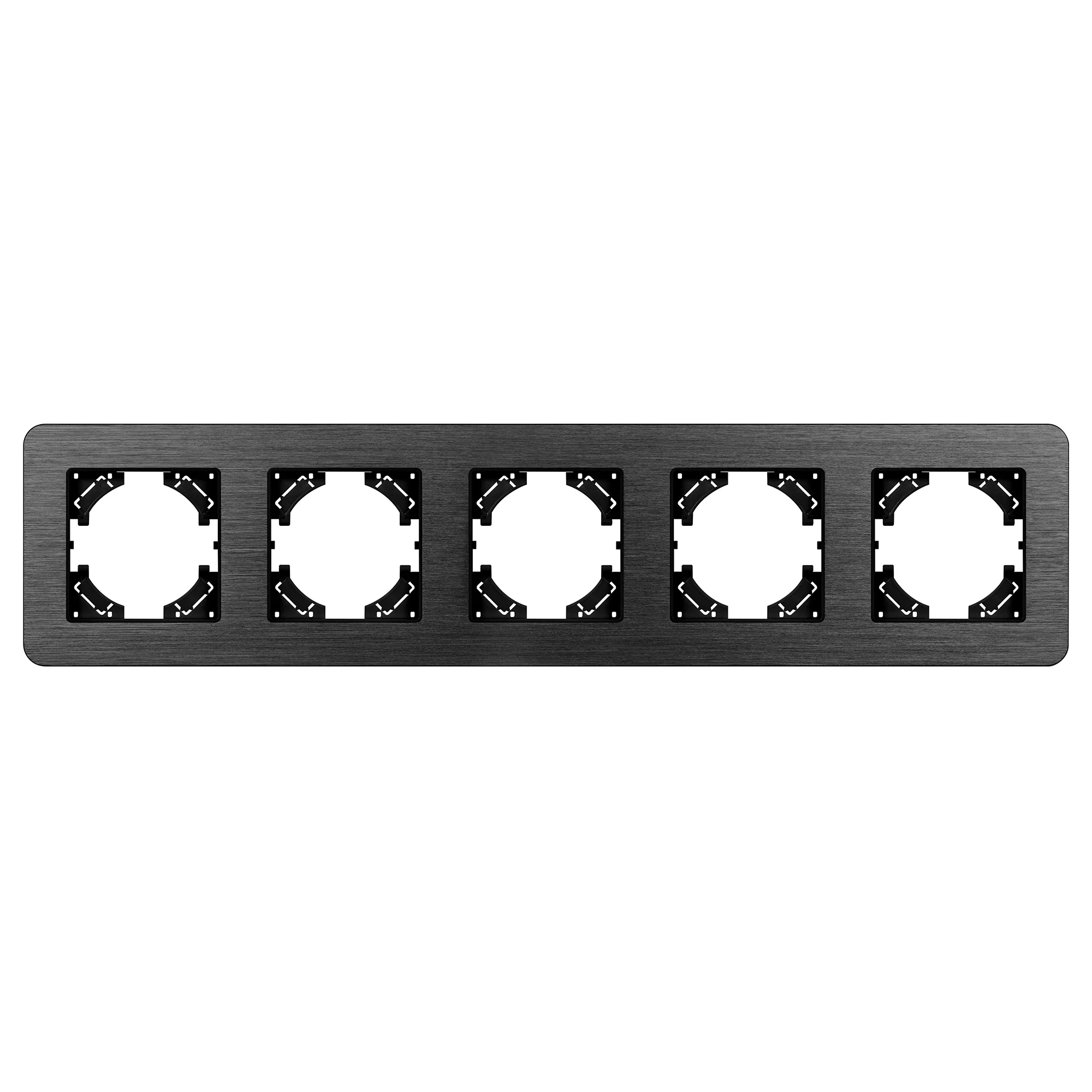 Рамка алюминиевая на 5 постов, под встраиваемый механизм. Цвет — черный с Soft-Touch покрытием. Среднего уровня герметичности IP20. Ориентация монтажа — горизонтальная (основным ориентиром служат посадочные выступы для накладки механизма). Габаритные размеры: длина 370 мм, ширина 86 мм, высота 7 мм Гарантийный срок 12 мес.