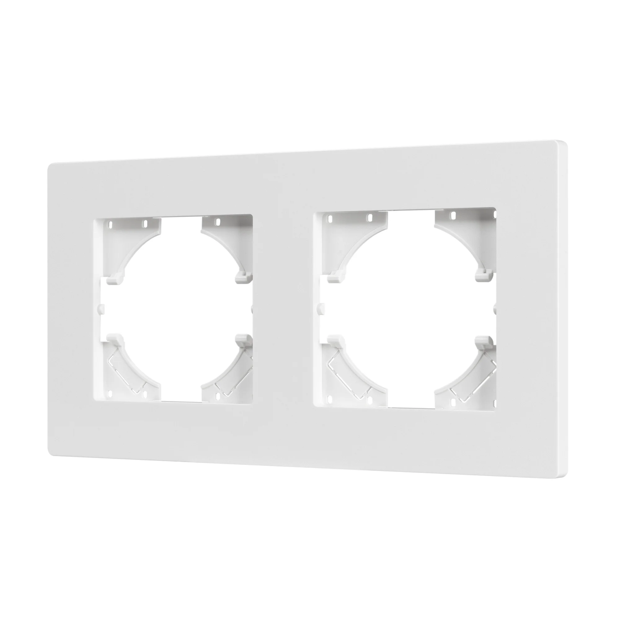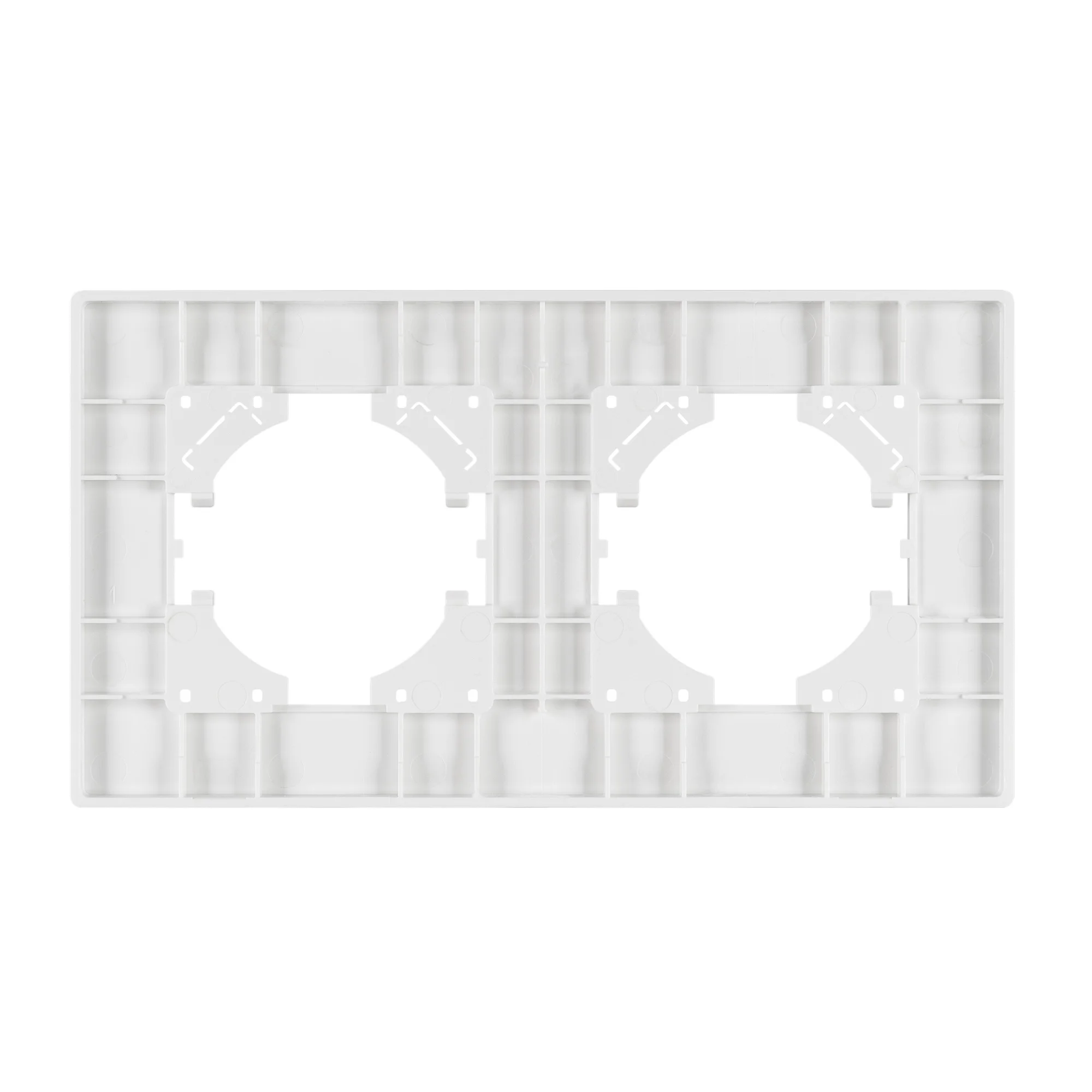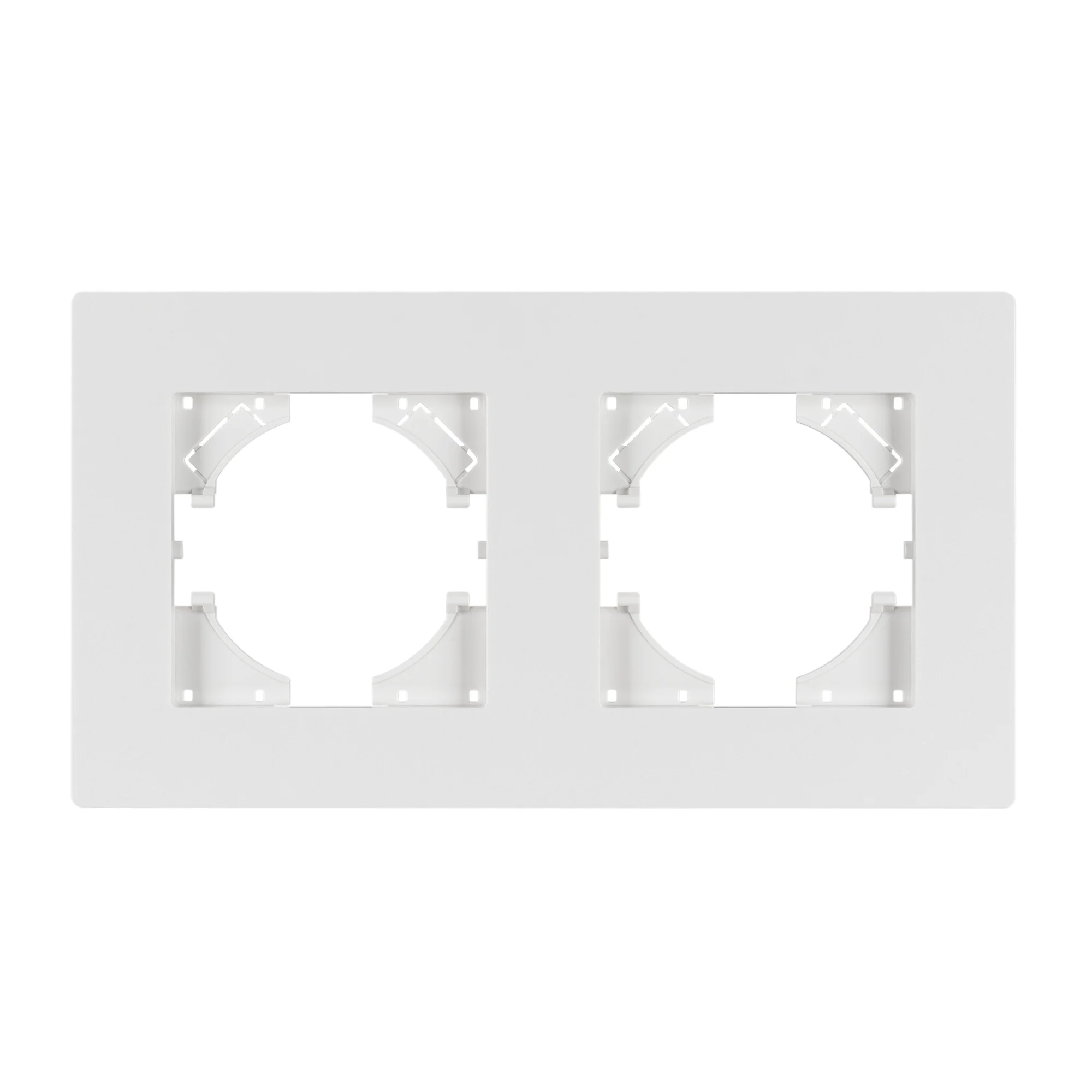 Рамка пластиковая на 2 поста, под встраиваемый механизм. Цвет — белый. Среднего уровня герметичности IP20. Ориентация монтажа — горизонтальная (основным ориентиром служат посадочные выступы для накладки механизма). Габаритные размеры: длина 157 мм, ширина 86 мм, высота 7 мм. Гарантийный срок 12 мес.
