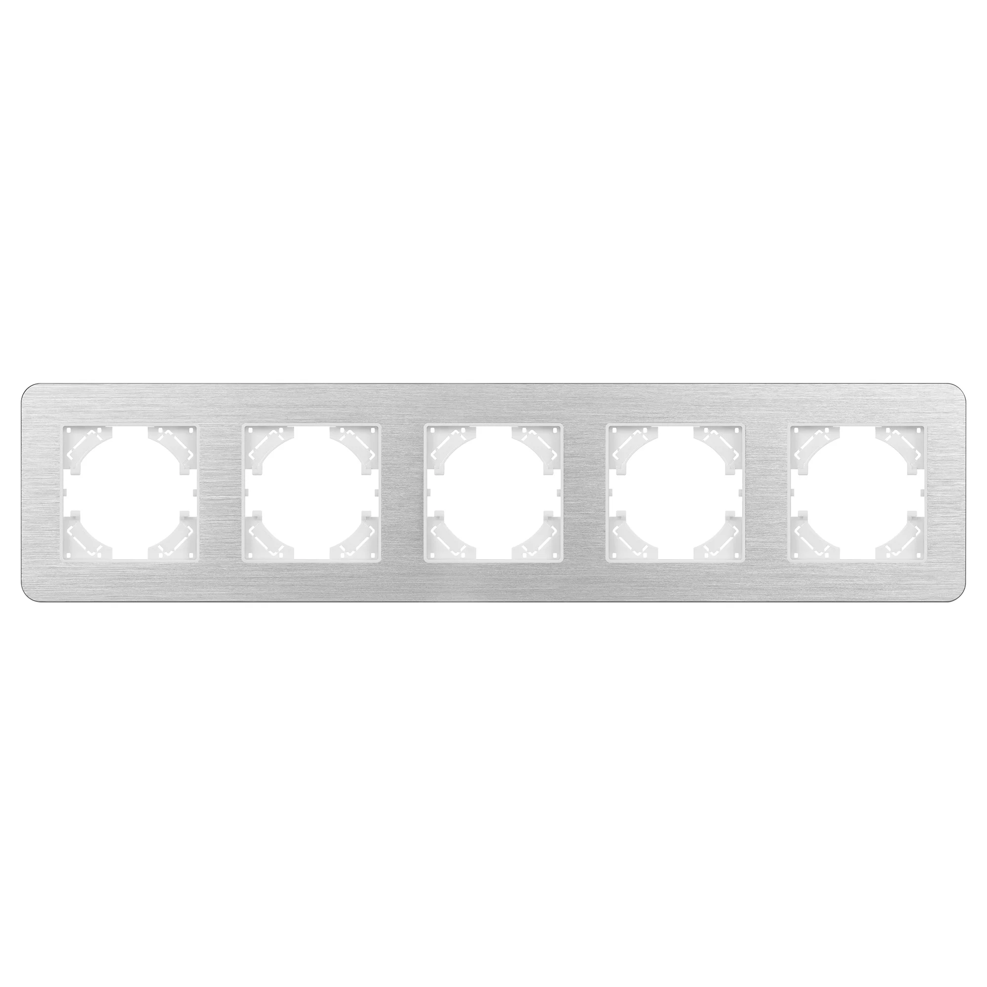 Рамка алюминиевая на 5 постов, под встраиваемый механизм. Цвет — серебристый. Среднего уровня герметичности IP20. Ориентация монтажа — горизонтальная (основным ориентиром служат посадочные выступы для накладки механизма). Габаритные размеры: длина 370 мм, ширина 86 мм, высота 7 мм. Гарантийный срок 12 мес.