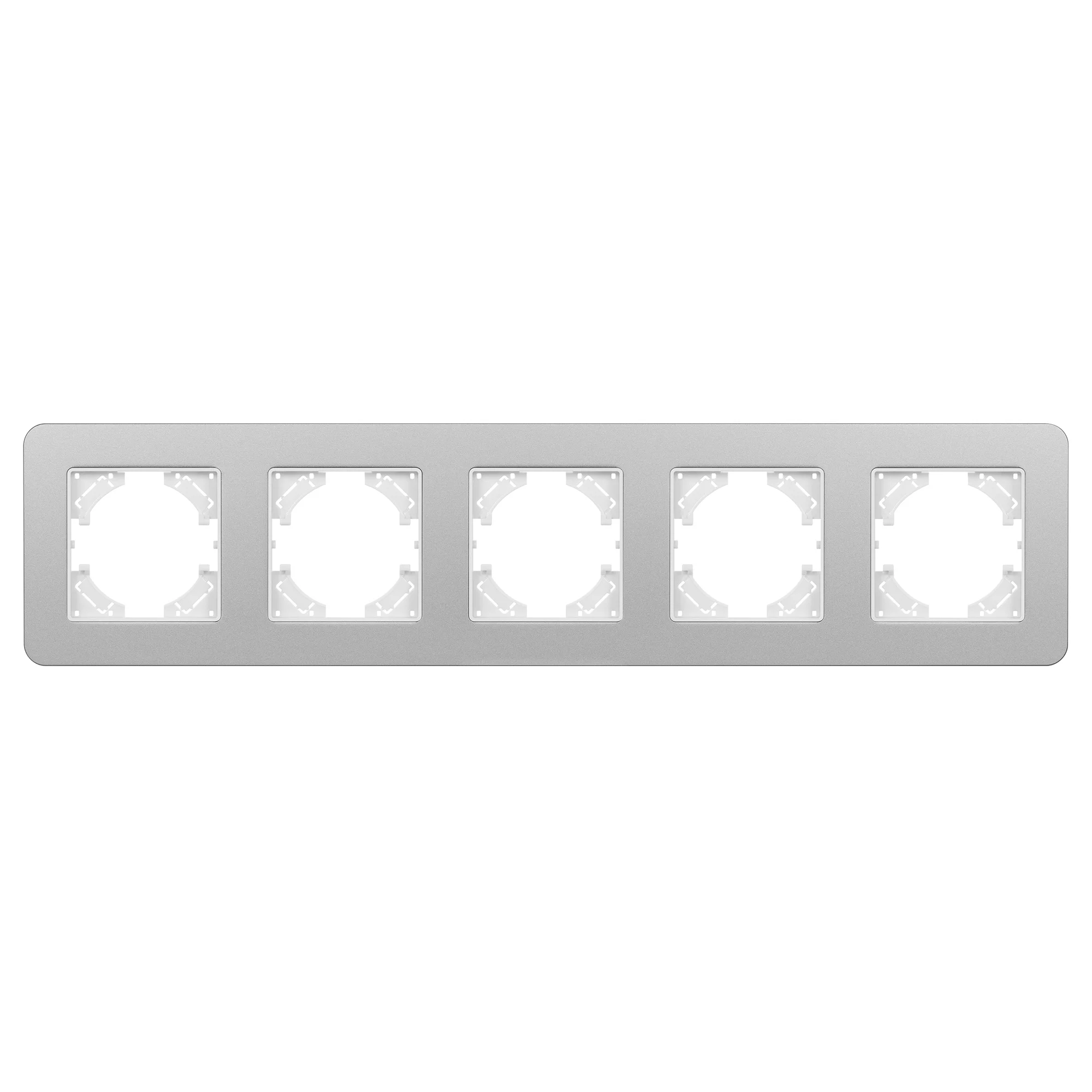 Рамка алюминиевая на 5 постов, под встраиваемый механизм. Цвет — серебристый с Soft-Touch покрытием. Среднего уровня герметичности IP20. Ориентация монтажа — горизонтальная (основным ориентиром служат посадочные выступы для накладки механизма). Габаритные размеры: длина 370 мм, ширина 86 мм, высота 7 мм. Гарантийный срок 12 мес.