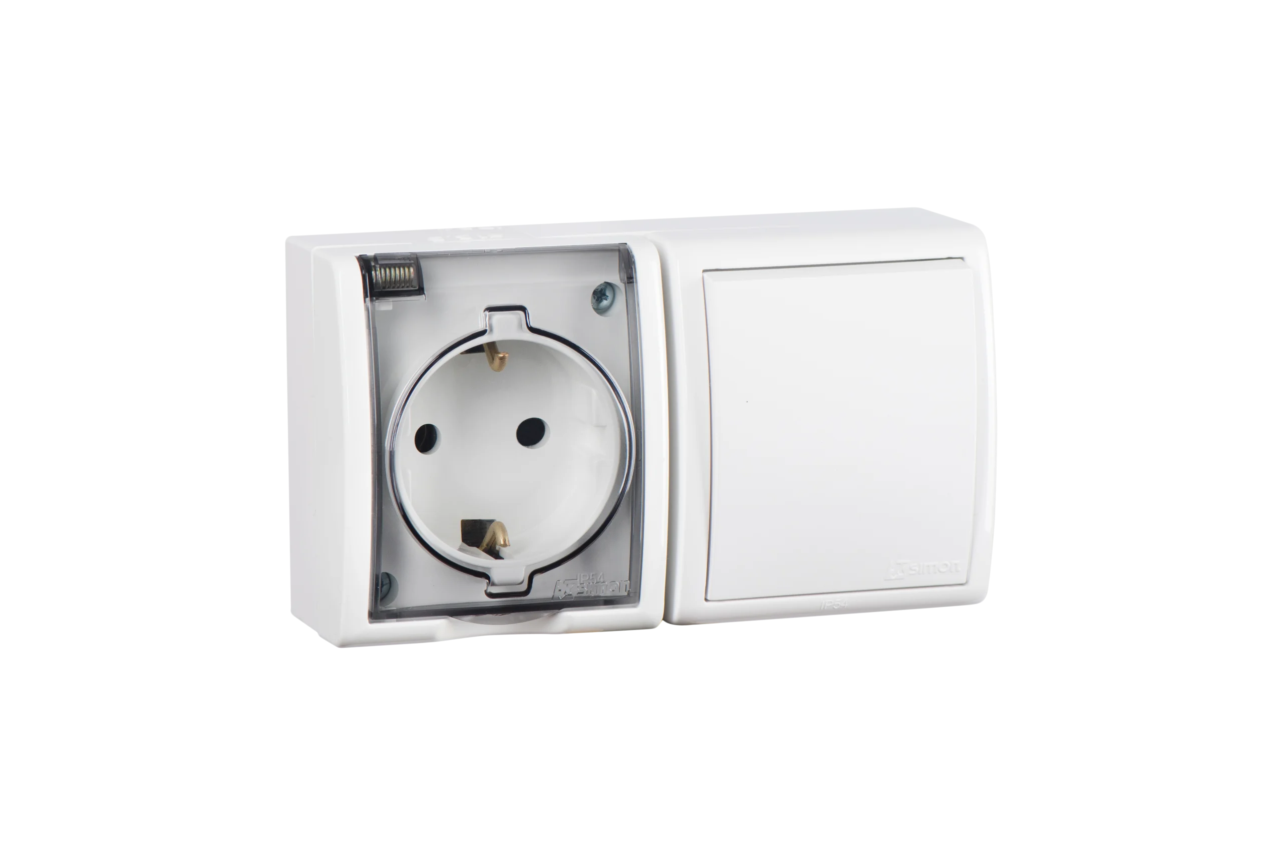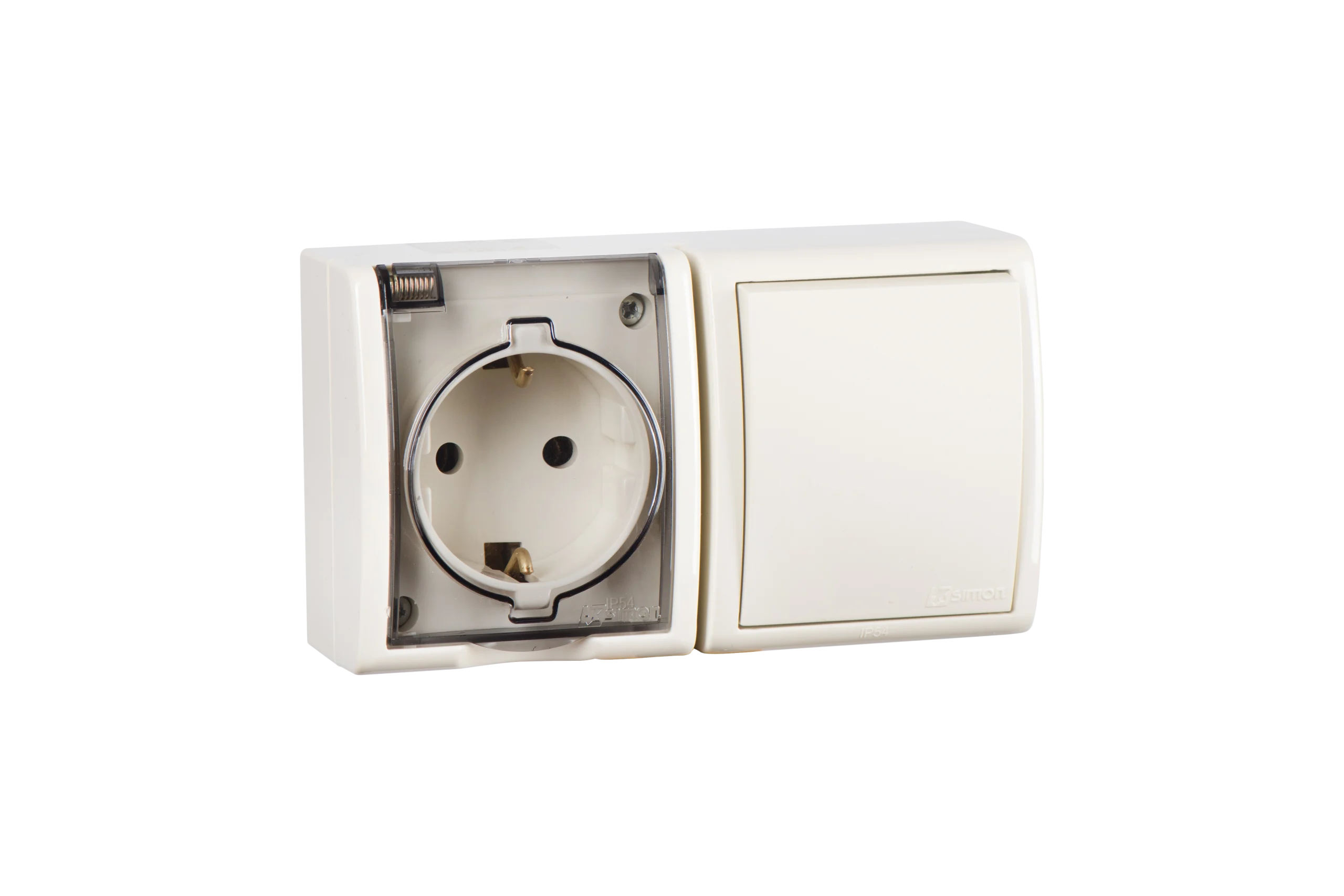 Systeme Electric Этюд наруж Бел Блок: Розетка с/з со шторками + переключатель 1-клавишный IP44
