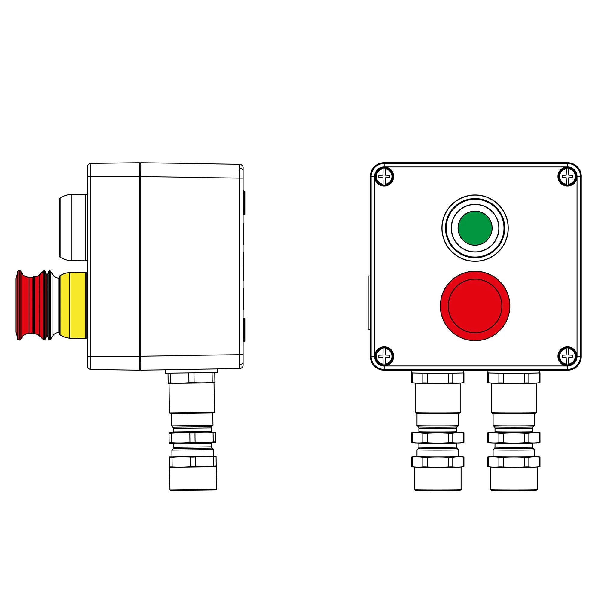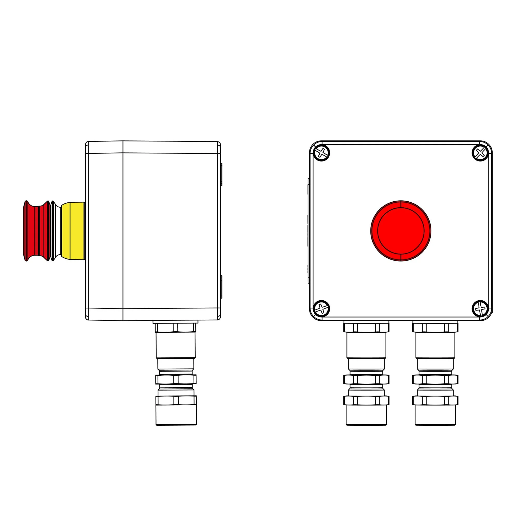 Кнопочный пост шириной 80 мм, высотой 150 мм и глубиной 85 мм, в котором толкателем выступает черная кнопка и красный гриб .