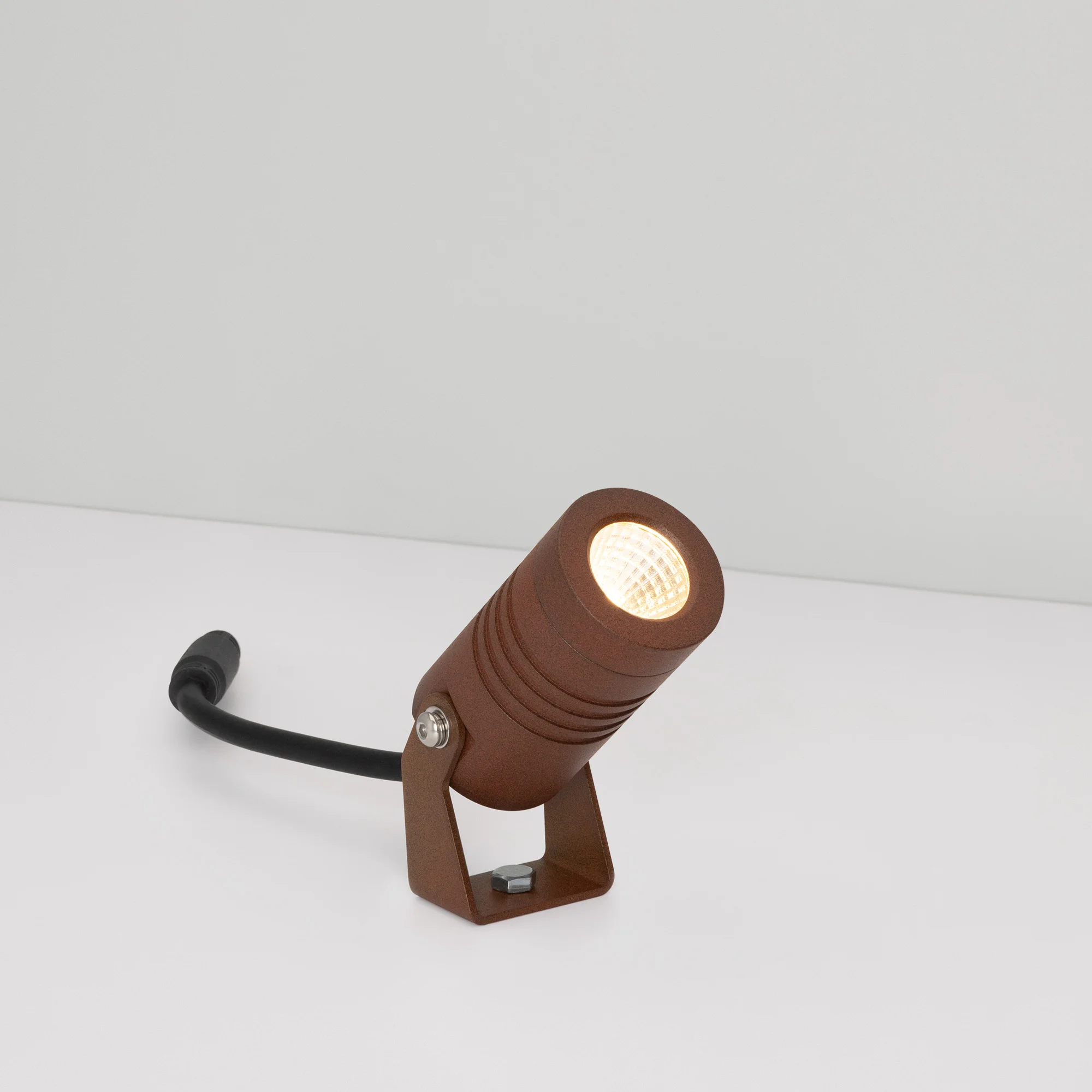 Уличный светодиодный прожектор, мощность 5Вт, угол освещения 25°. Цвет ТЕПЛЫЙ 3000К, световой поток 310лм. Влагозащищенный корпус IP67 — цвет кортен — алюминий, экран из закалённого стекла. Угол поворота корпуса в вертикальной плоскости 135°. Питание 230В, мощность 5 Вт. Размеры DxH -Ø42х77мм. В комплекте 1м провод.