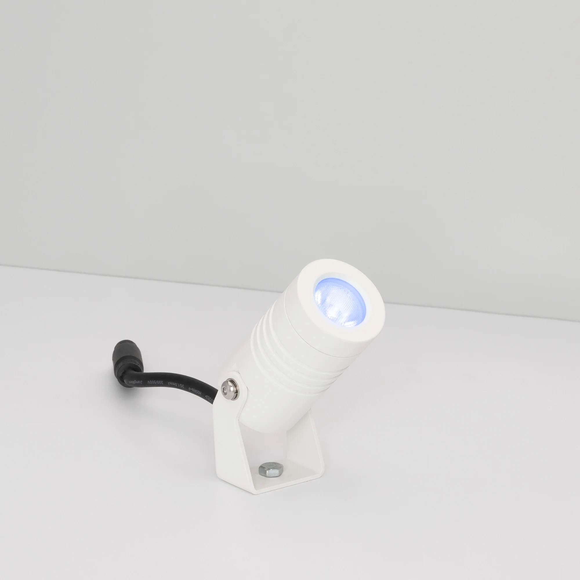 Уличный светодиодный прожектор, мощность 6Вт, угол освещения 25°. Цвет свечения RGB, световой поток 200лм. Влагозащищенный корпус IP67 — белый алюминий, экран из закаленного стекла. Угол поворота корпуса в вертикальной плоскости 135°. Питание DC12В, мощность 6Вт. Размеры DxH — Ø42×75мм. В комплекте 1м провод.