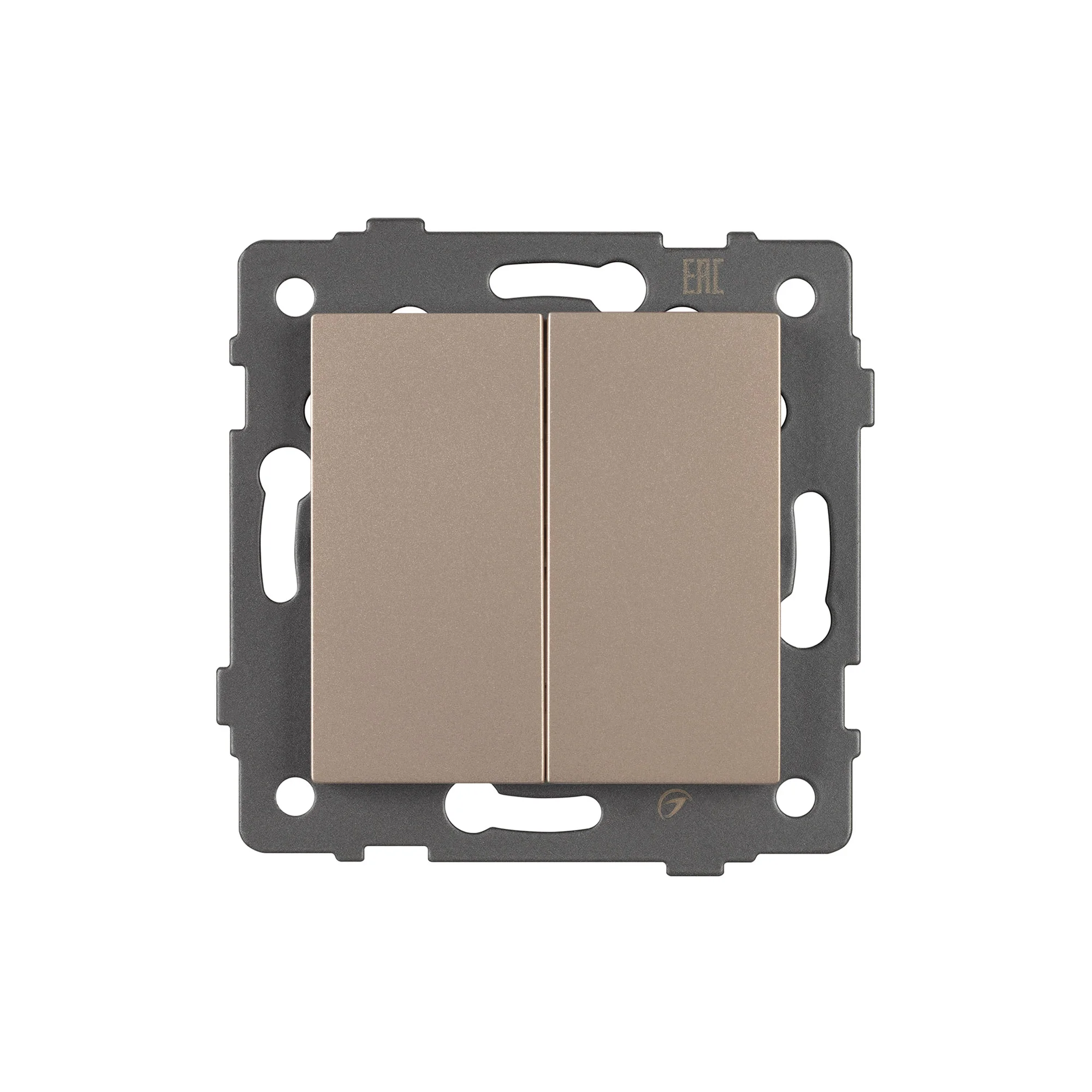 Механизм выключателя света клавишный на 1 пост 2 клавиши (непроходной). Цвет — золотой. Без фронтальной рамки. Уровень пылевлагозащиты IP20. Выключатель устанавливается в стандартный круглый подрозетник. Габаритные размеры: длина 71 мм, ширина 71 мм, высота 52 мм. Гарантийный срок 10 лет.