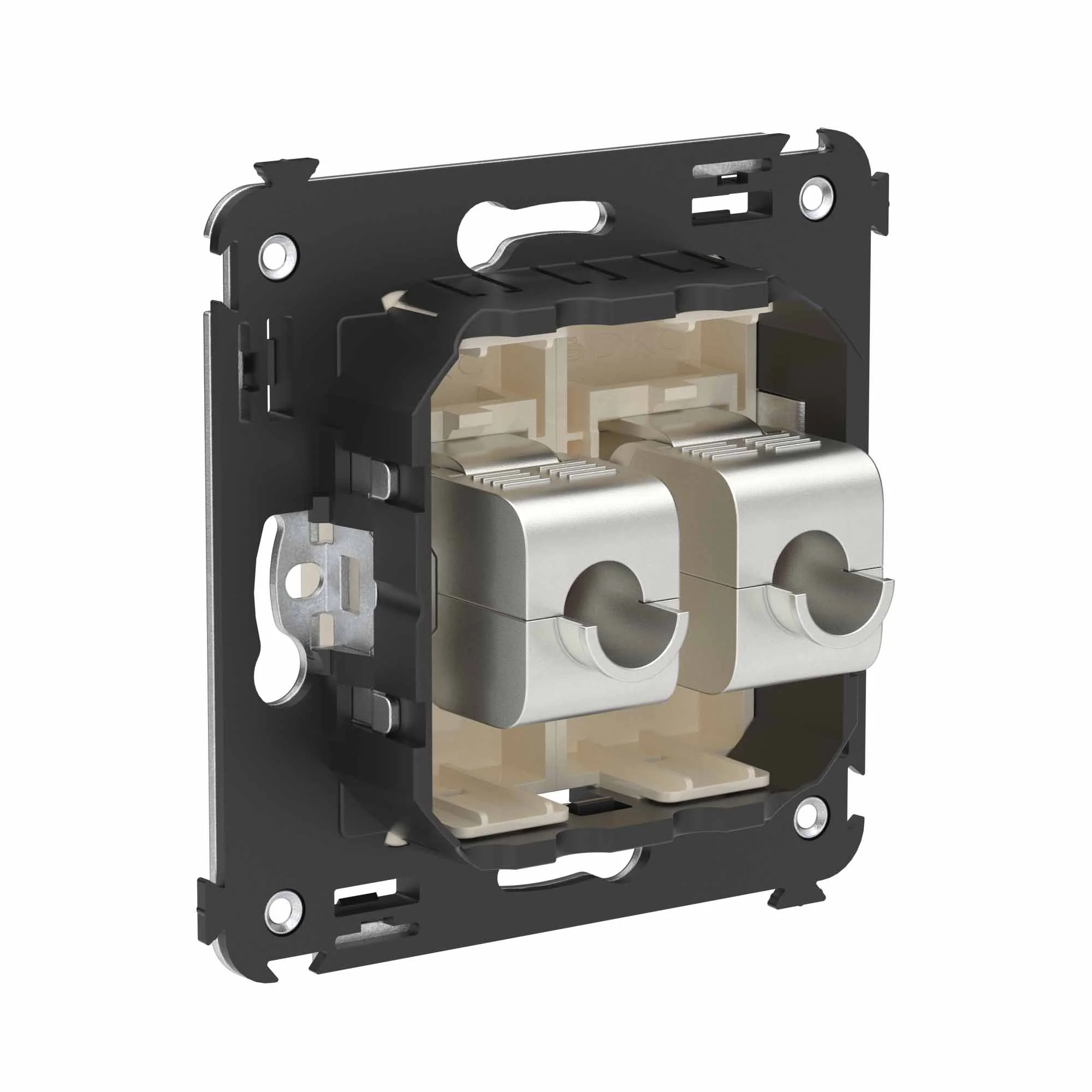 Телефонная розетка RJ-12 двойная без шторки используется для коммутации линий телефонной связи в патч-панелях или для связи телефонных аппаратов с розеткой. Предназначена для скрытого монтажа в стену, поставляется в комплекте с суппортом. Материал – металл, термопласт. Пластиковые детали электроустановочного изделия имеют цвет «Черный матовый».