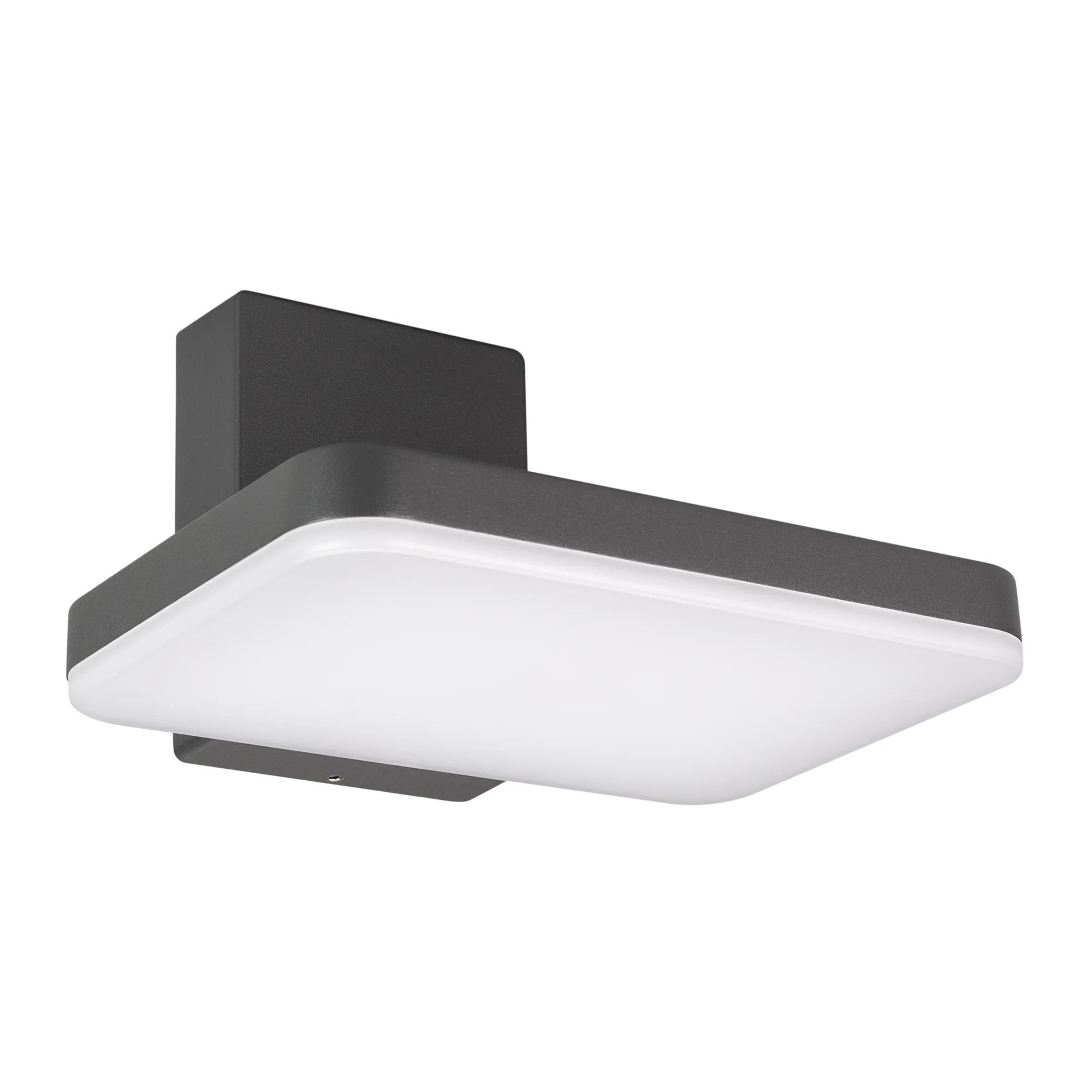 Настенный светильник для подсветки входных групп и фасадов зданий. Цвет ТЕПЛЫЙ БЕЛЫЙ 3000К, 9Вт (830лм). Влагозащищенный корпус IP65 — серый алюминий, экран из поликарбоната. Питание 220В, мощность 9Вт. Размеры ДхШхВ 200х176х125мм.