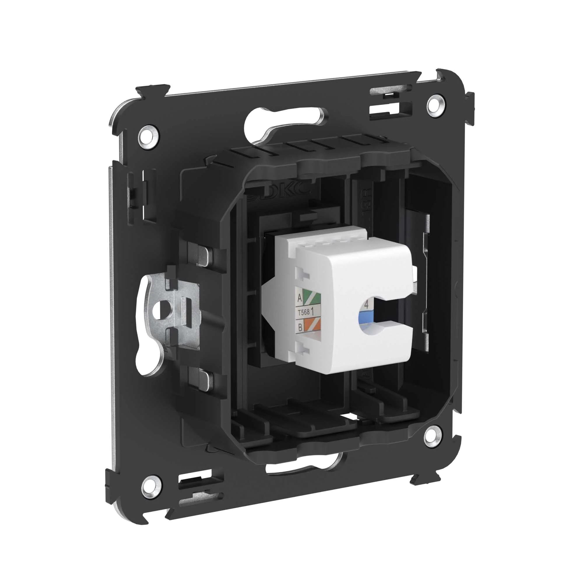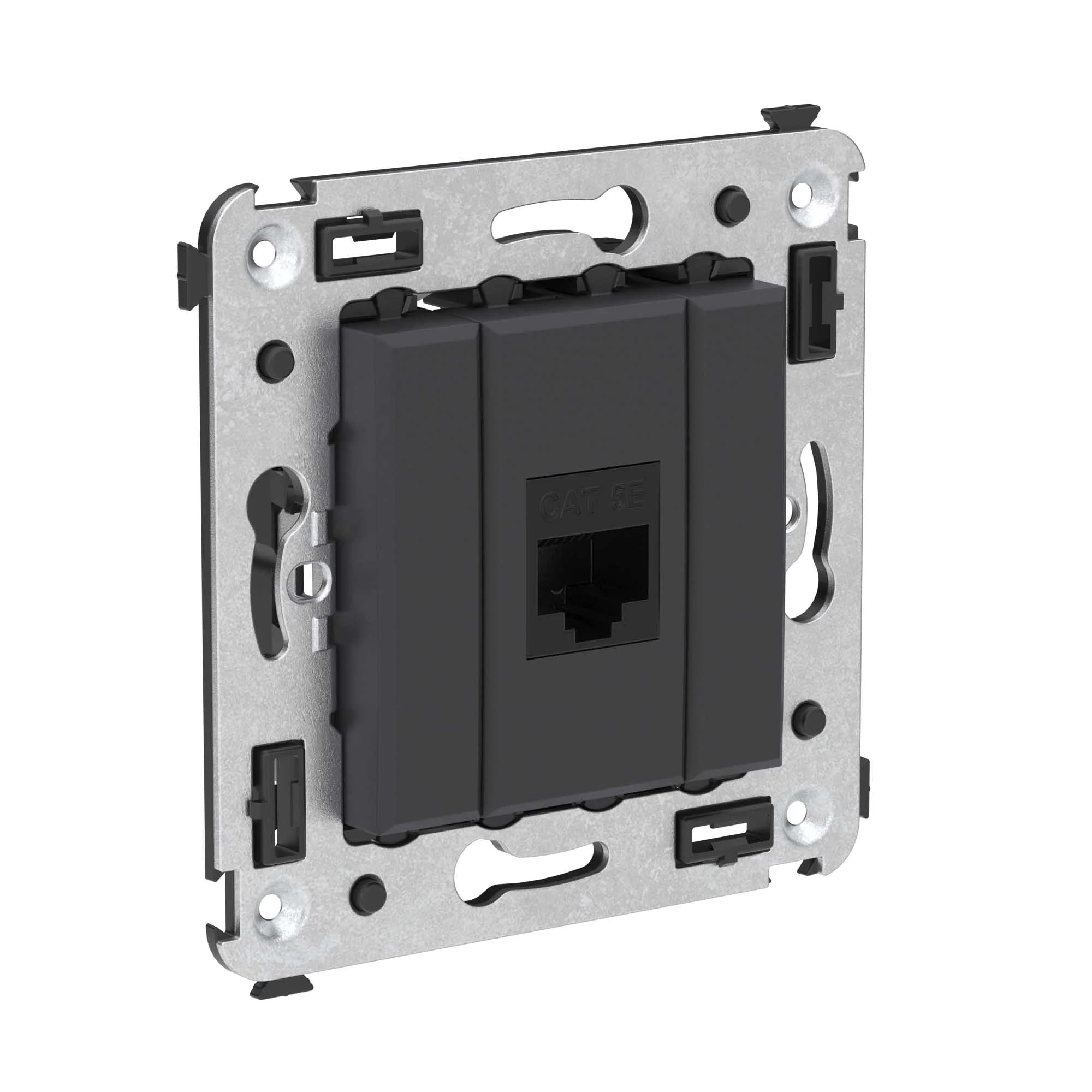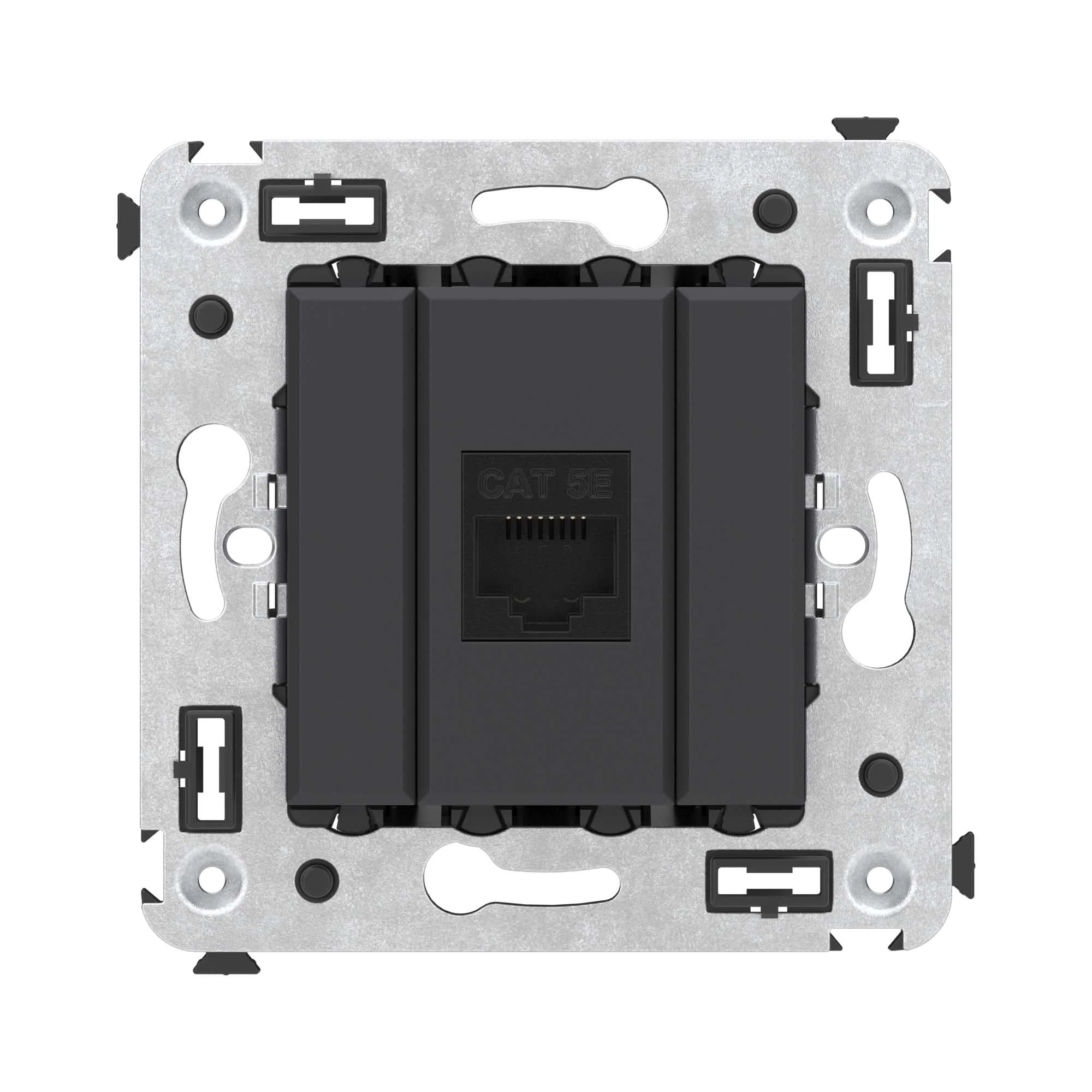 Компьютерная розетка RJ-45 в стену, одинарная. Категория: 5e. Предназначена для монтажа в подрозеточные коробки глубиной не менее 45 мм (код 59301); подключение сетевого кабеля к рабочему месту. Характеристики: 8P8C; с пылезащитной шторкой; с маркировочной табличкой; возможность заделки без инструмента. Цвет: «Черный матовый».