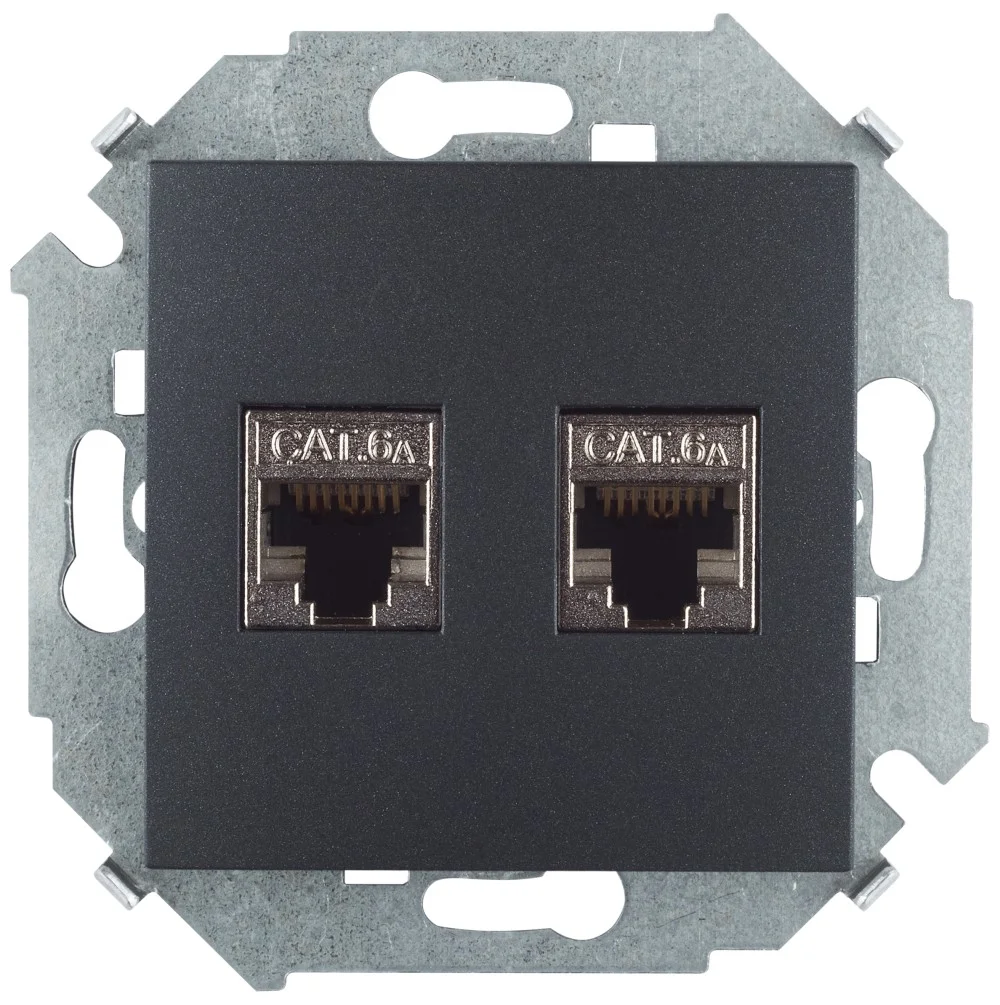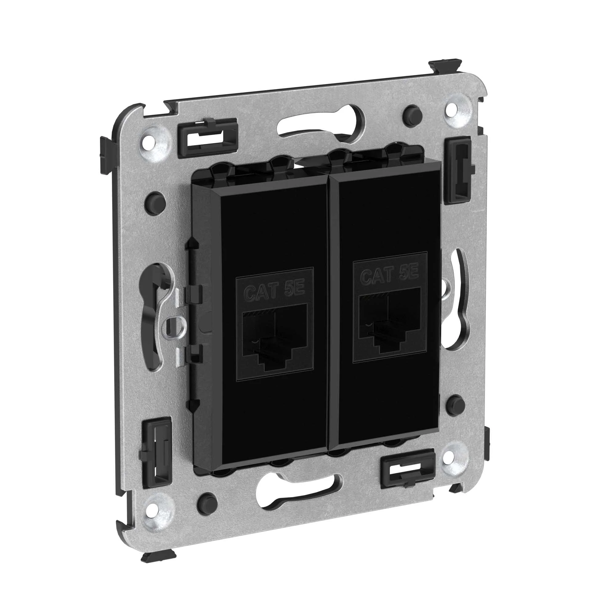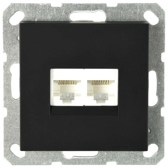 Компьютерная розетка RJ-45 в стену, двойная. Категория: 6. Предназначена для монтажа в подрозеточные коробки глубиной не менее 45 мм (код 59301). Используется для подключение сетевого кабеля к рабочему месту. Характеристики: 8P8C; с пылезащитной шторкой; с маркировочной табличкой. Заделка не требует инструмента. 2 модуля. Цвет: «Черный матовый».