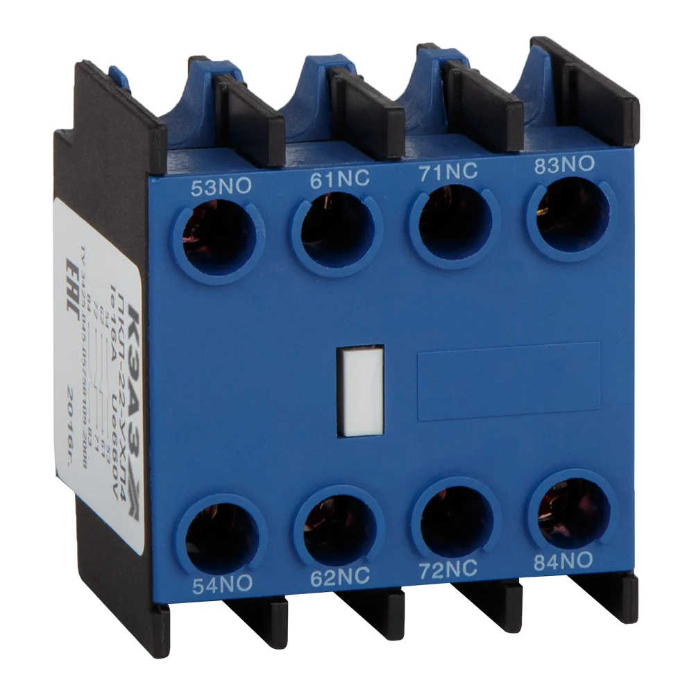 Блок дополнительных контактов для контакторов серии SystemePact MC1D; конфигурация 4НО; фронтальный монтаж с помощью винтовых зажимов. Блоки дополнительных контактов применяются совместно с контакторами и предназначены для увеличения количества вспомогательных контактов, использующихся в цепях сигнализации и управления.