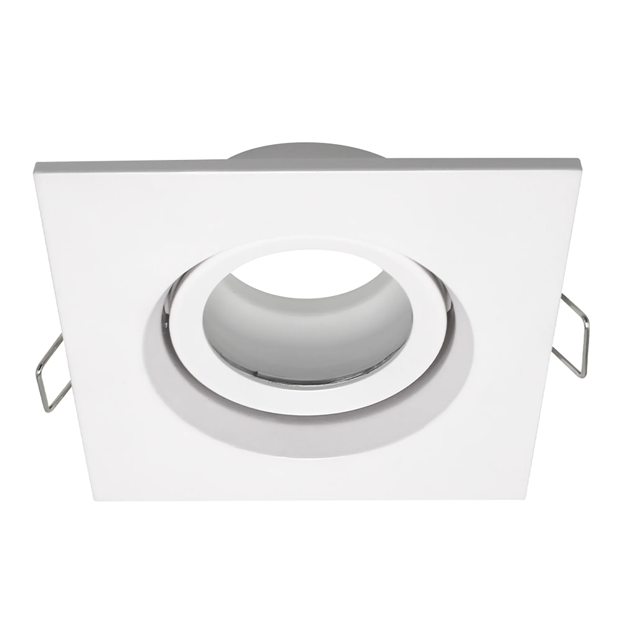 Встраиваемый светильники с цоколем GU10 с широкой рамкой. Представлен в черном и белом цвете, в круглом и прямоугольном корпусе.