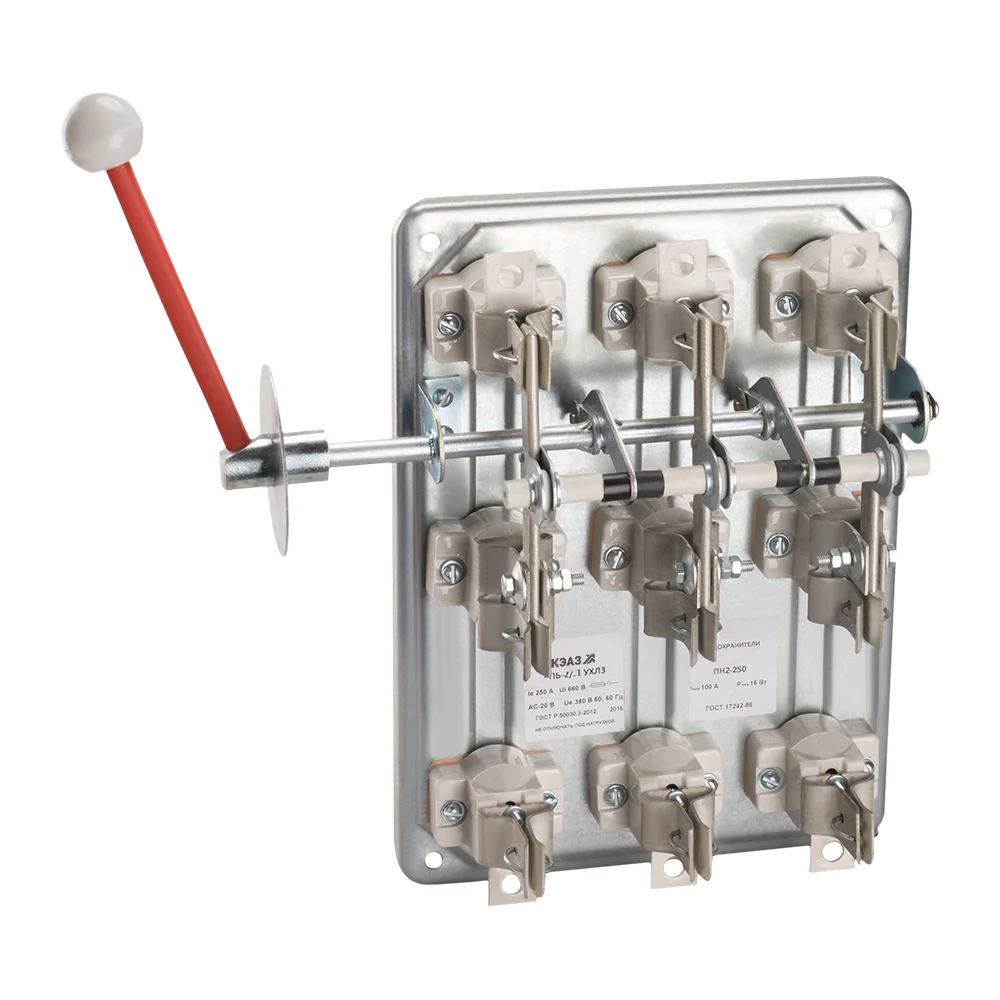 Выключатель-разъединитель 3 полюсный на номинальный ток 630 А, номинальный условный ток короткого замыкания Iq 32 (кА), где установлена передняя смещенная рукоятка, а максимальное сечение присоединяемых медных шин составляет 480 кв. мм.