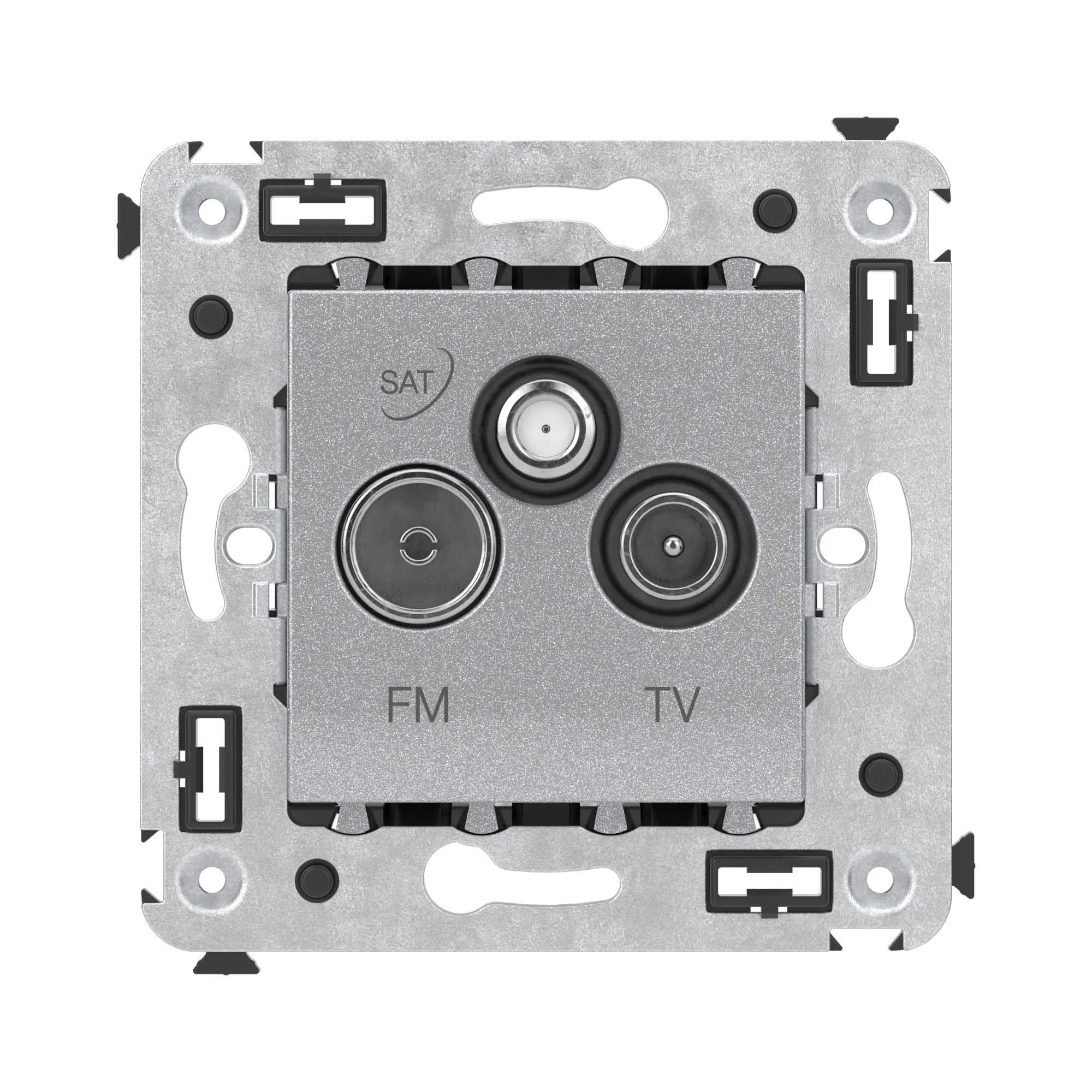 Розетка TV-FM-SAT. Назначение: для монтажа в подрозеточные коробки глубиной не менее 45 мм (код 59301);. Предназначена для подключения телевизионного, спутникового телевизионного и радио- кабеля к телевизору. Характеристики: винтовые зажимы; диапазон рабочих частот 4–2400 МГц; затухание