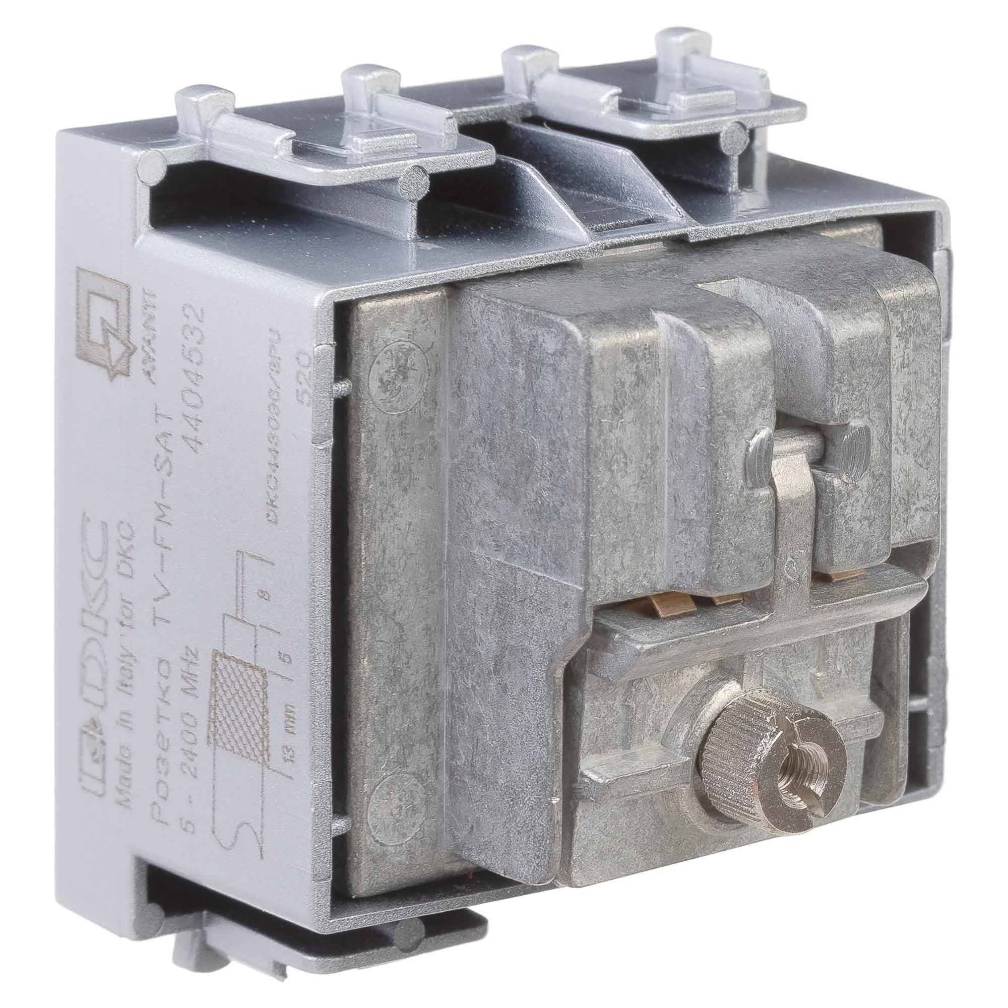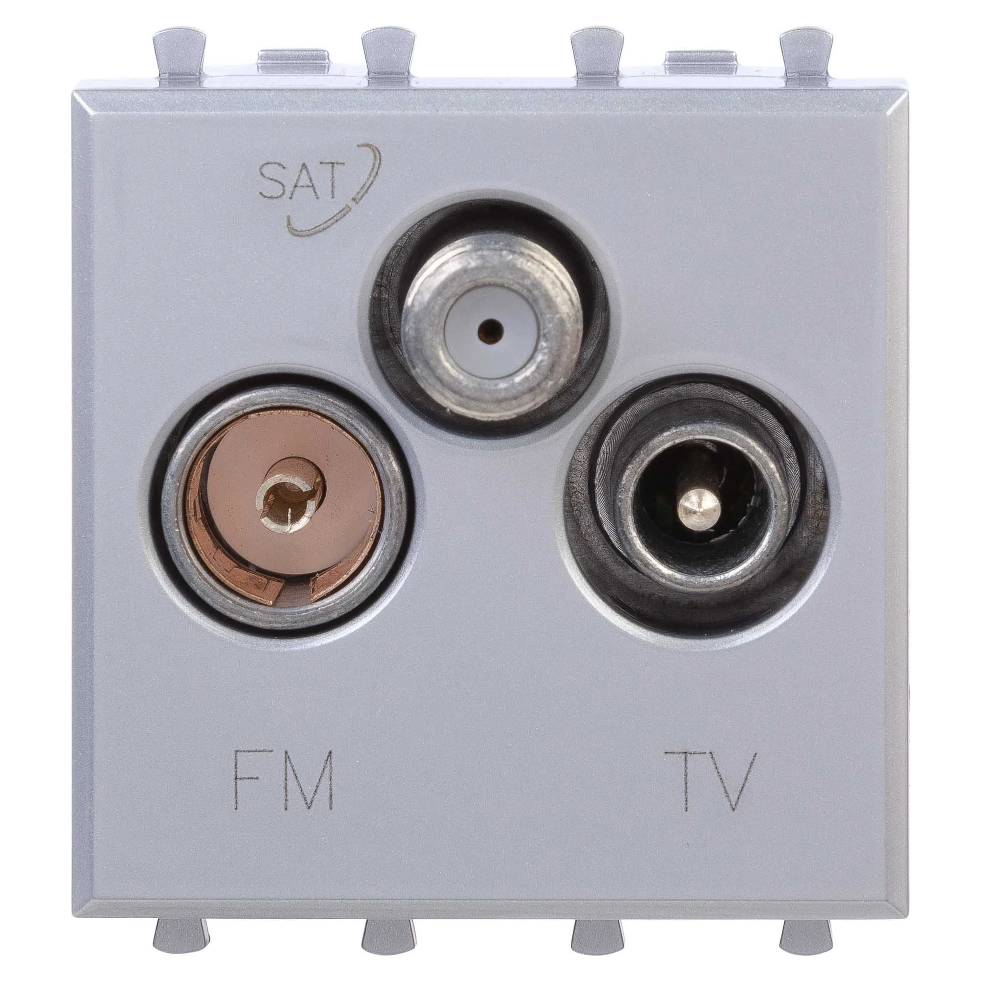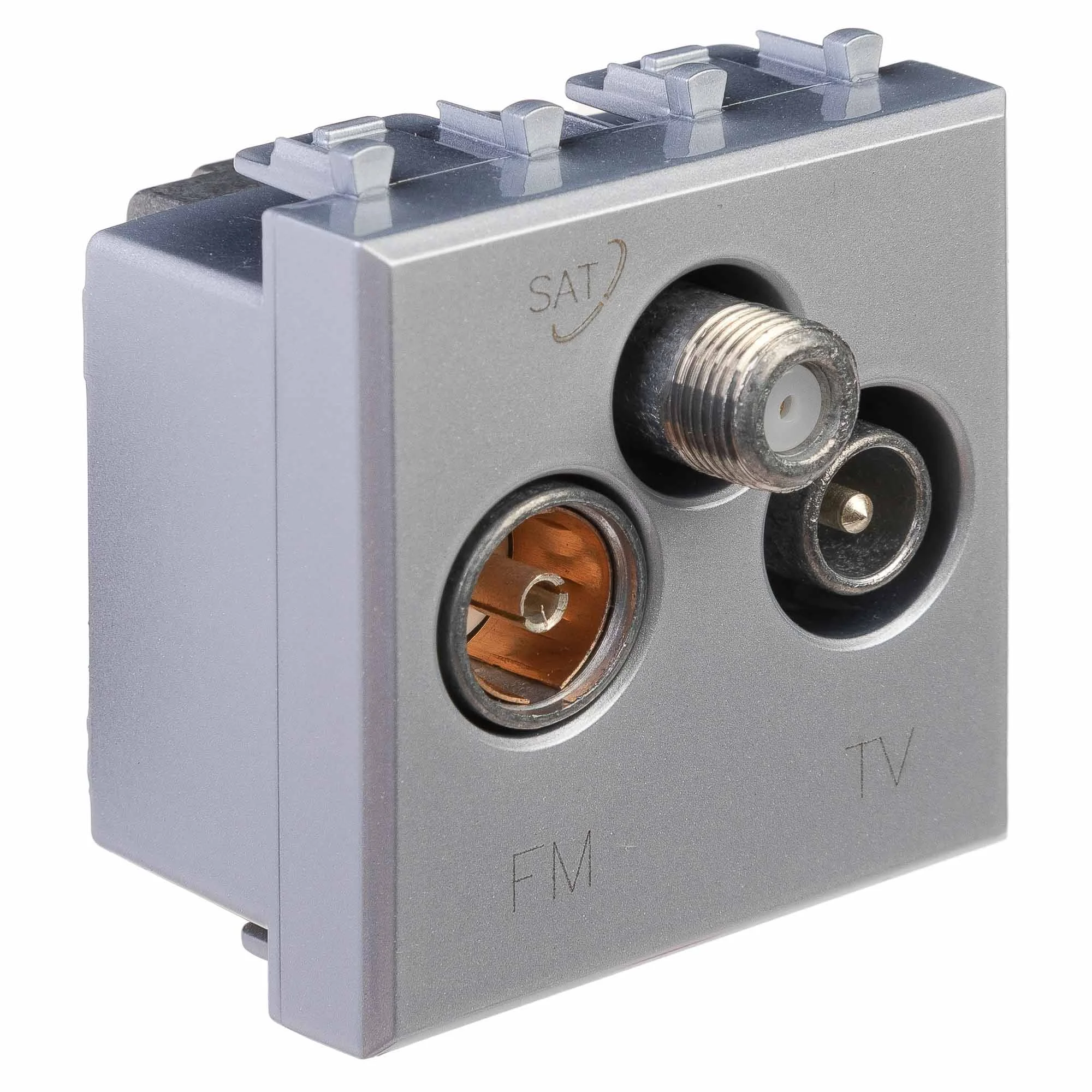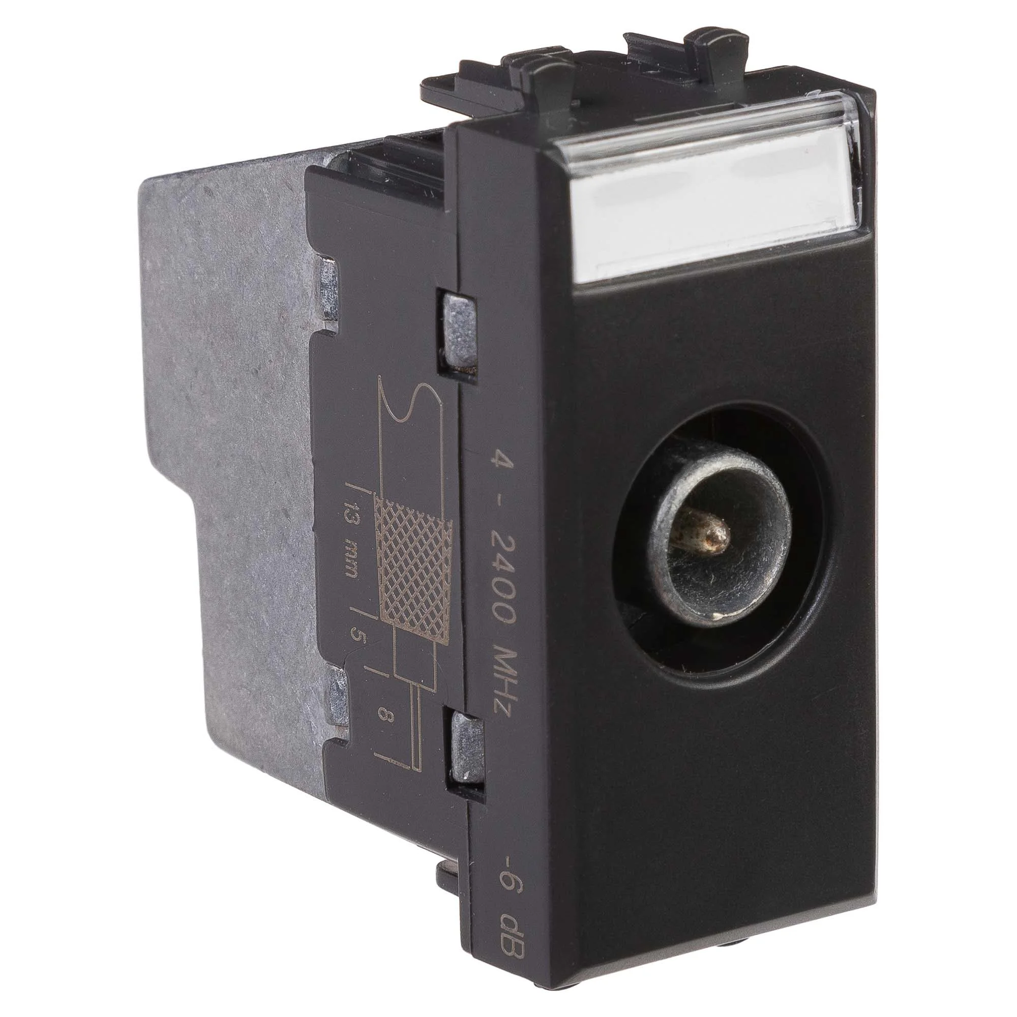 Розетка TV-FM-SAT модульная. Назначение: для монтажа в систему кабельных коробов «In-liner Front» и систему организации рабочих мест «Sotto» (алюминиевые кабель-каналы, колонны, башенки и лючки) при помощи рамок-суппортов и каркасов «Avanti» (код 4400912 и т.д.); подключение теле- и радиокабеля. Характеристики: винтовые зажимы; диапазон рабочих частот 4–2400 МГц; затухание