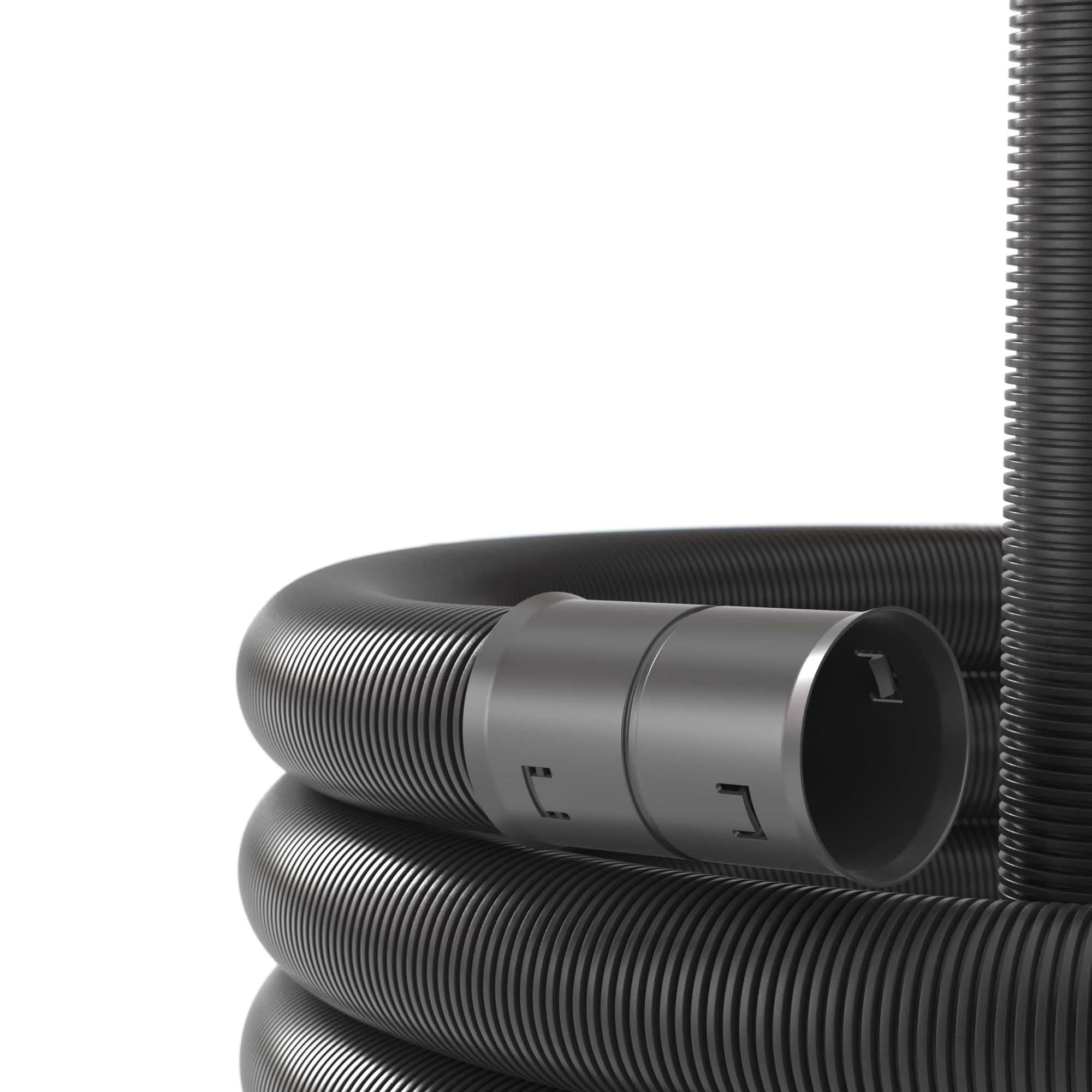 Двустенные гибкие электротехнические трубы могут использоваться как для прокладки кабеля, так и для организации ливневой организации. В первом случае удобнее использовать трубы с протяжкой — она позволяет легко проложить кабель во внутреннем пространстве трубы. Труба имеет высокую кольцевую жесткость. Диаметр 75 мм, поставляется бухтами по 100 метров. Материал — ПНД.