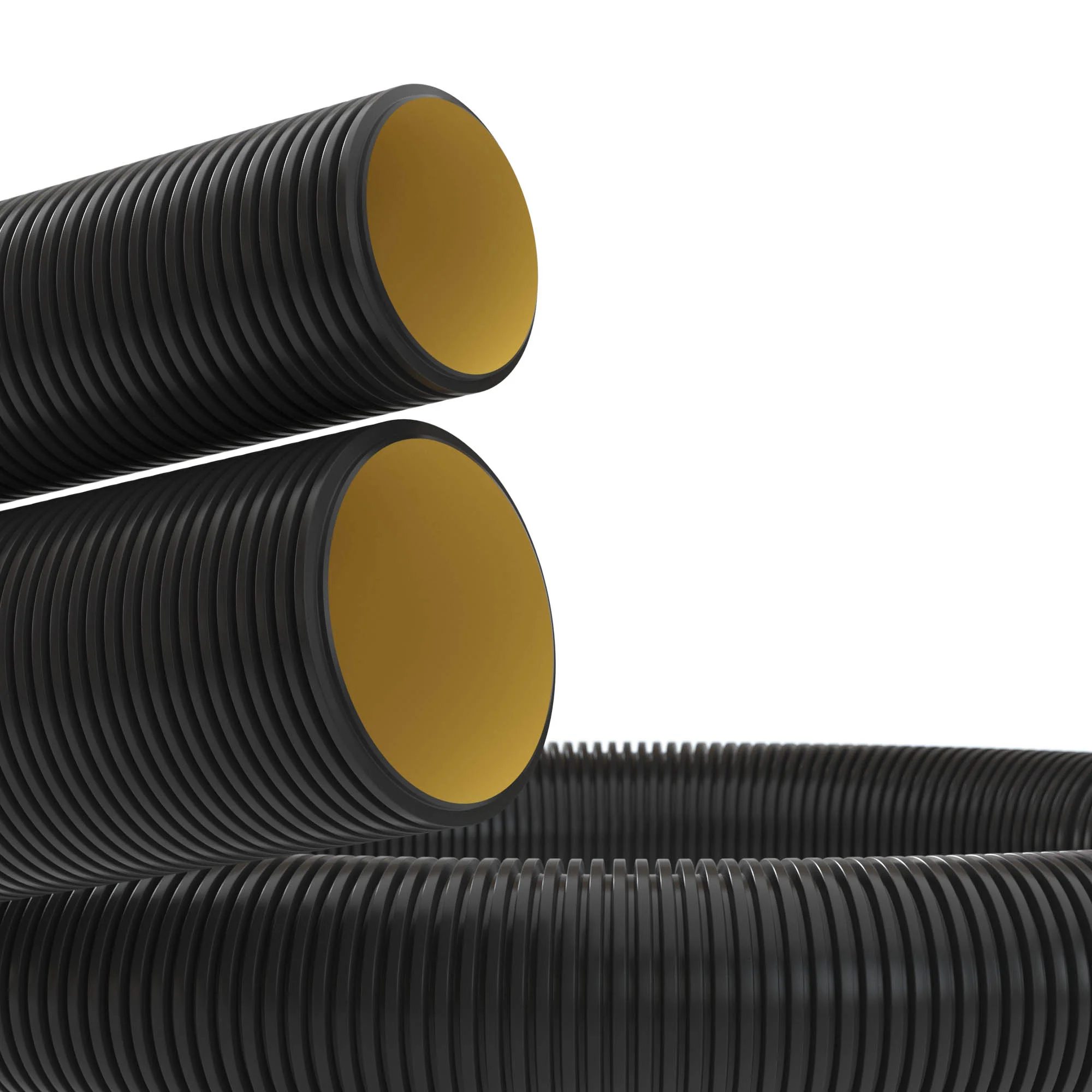 Двустенные гибкие электротехнические трубы могут использоваться как для прокладки кабеля, так и для организации ливневой организации (для этого отлично подходят трубы без протяжки). Труба имеет высокую кольцевую жесткость. Диаметр 110 мм, поставляется бухтами по 100 метров. Материал — ПНД.
