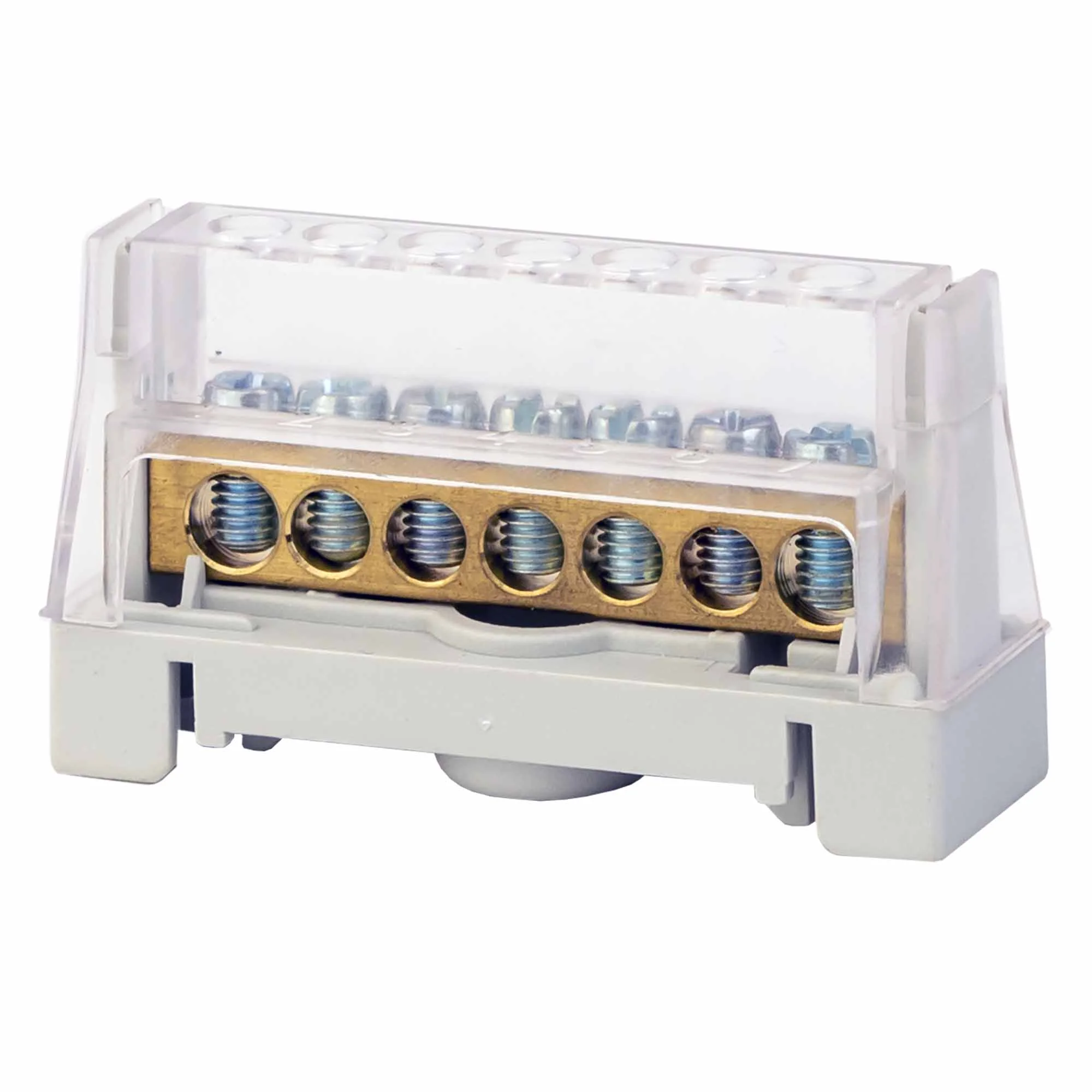 DKC Шина латунная в корпусе на DIN рейку 1 полюс до 63A 5конт. под сеч. 16кв.мм, 2конт. под сеч. 25кв.мм,