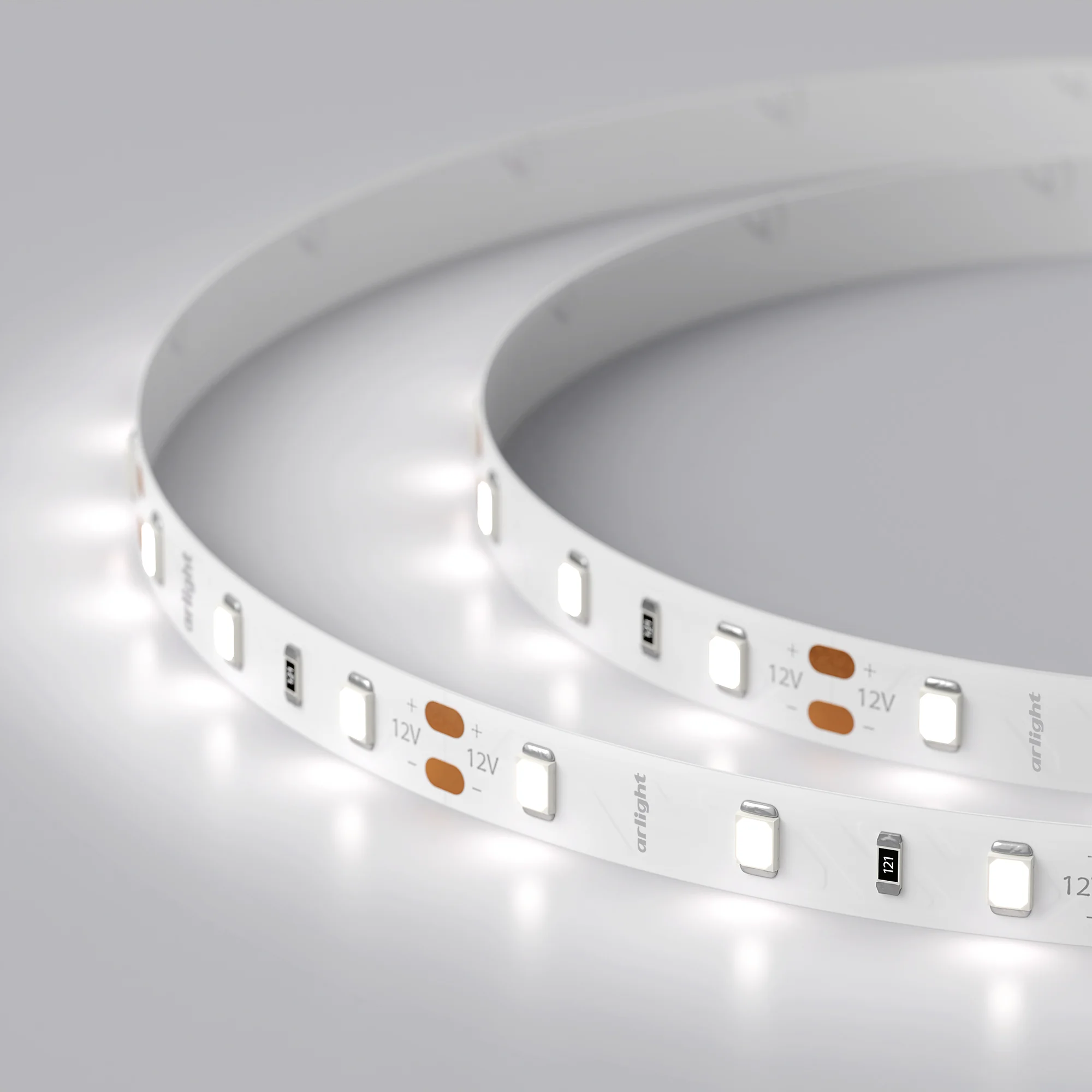 Светодиодная лента RT серии A60. Светодиоды SMD 2835, 60 шт/м, белая плата шириной 8 мм, скотч 3M. Цвет БЕЛЫЙ 6000K, индекс цветопередачи CRI>85, угол 120°. Питание 12 В, мощность 7.2 Вт/м (36 Вт на 5 м). Размеры 5000x8x1.5 мм. Мин. отрезок 50 мм, 3 светодиода. Цена за 1 м. Кратность заказа поставщику: 5 м.