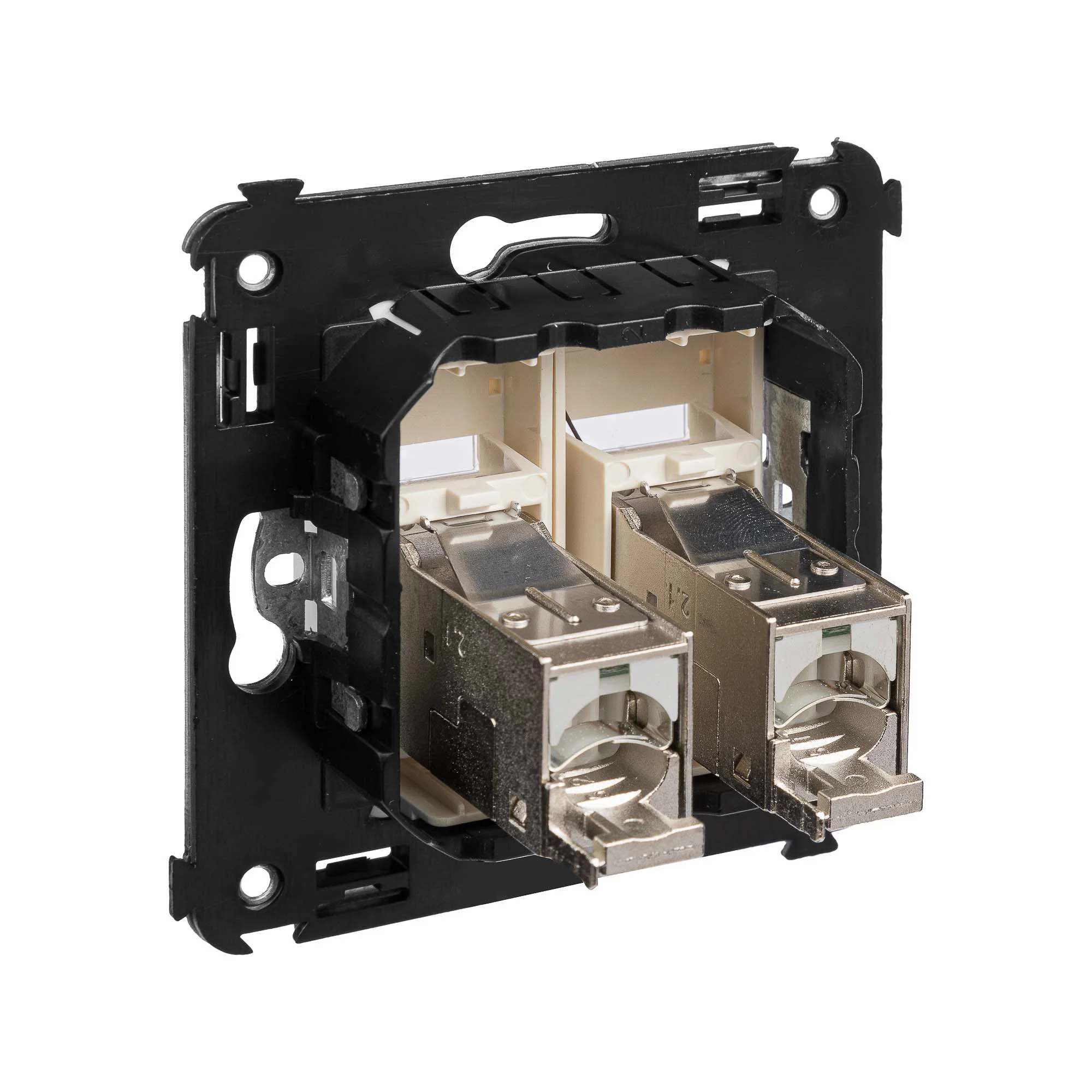 Телефонная розетка RJ-12 двойная без шторки используется для коммутации линий телефонной связи в патч-панелях или для связи телефонных аппаратов с розеткой. Предназначена для скрытого монтажа в стену, поставляется в комплекте с суппортом. Материал – металл, термопласт. Пластиковые детали электроустановочного изделия имеют цвет «Черный квадрат».