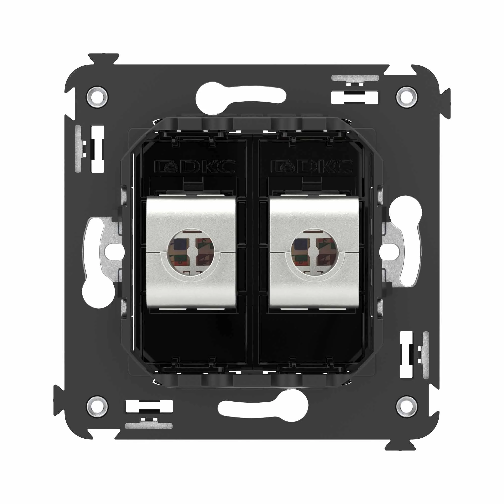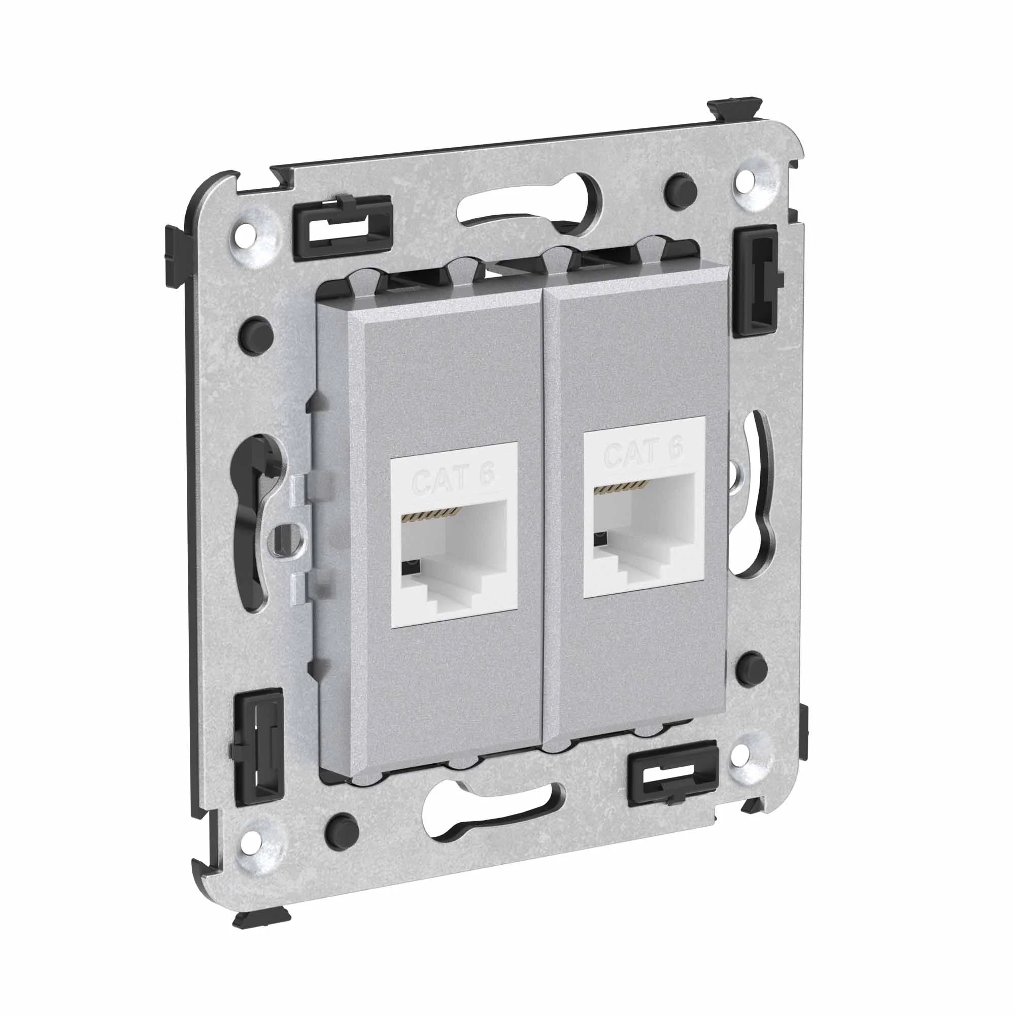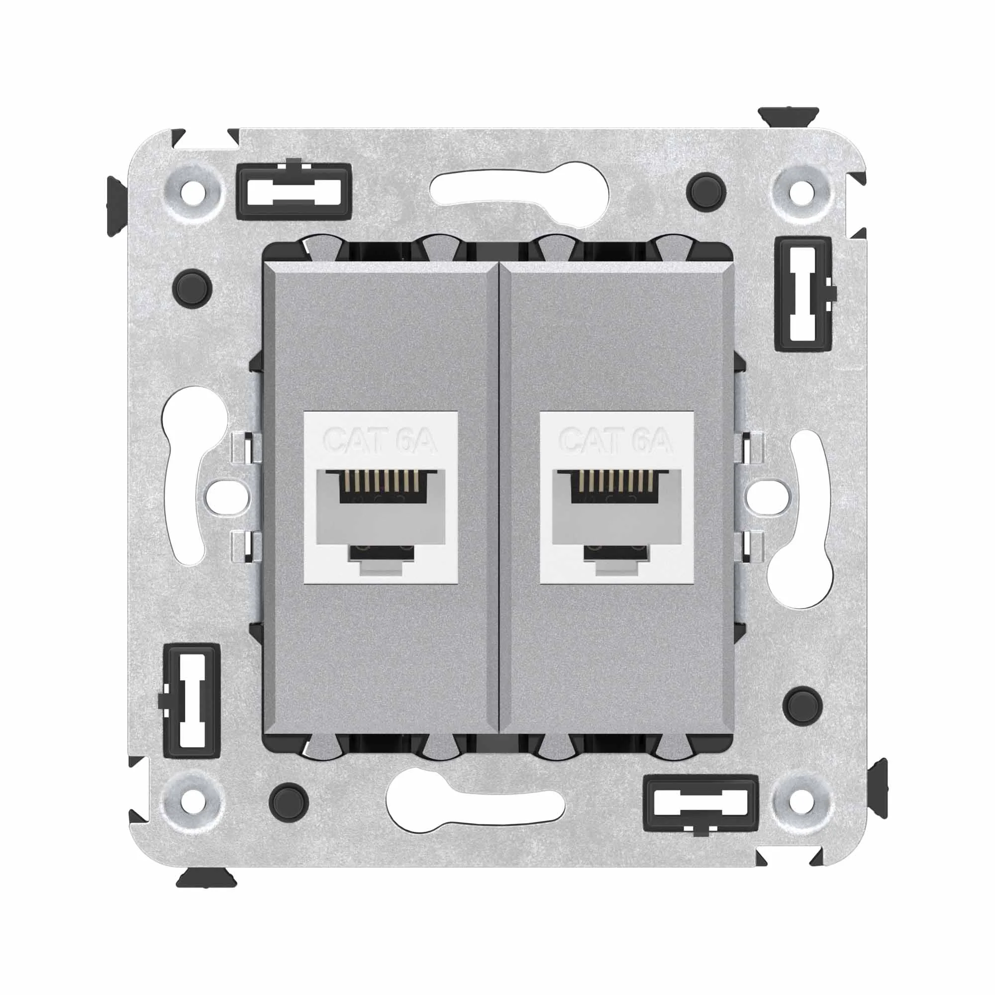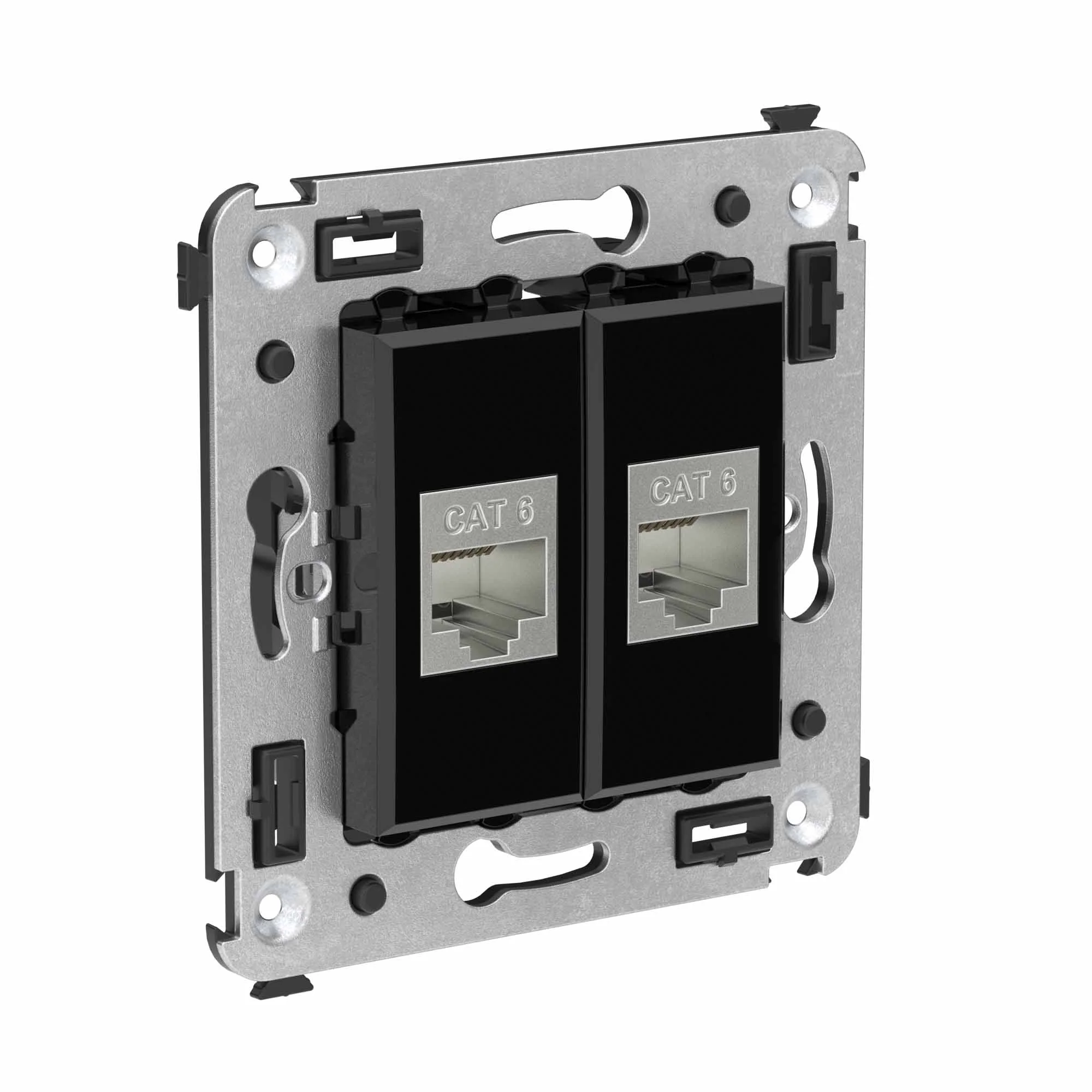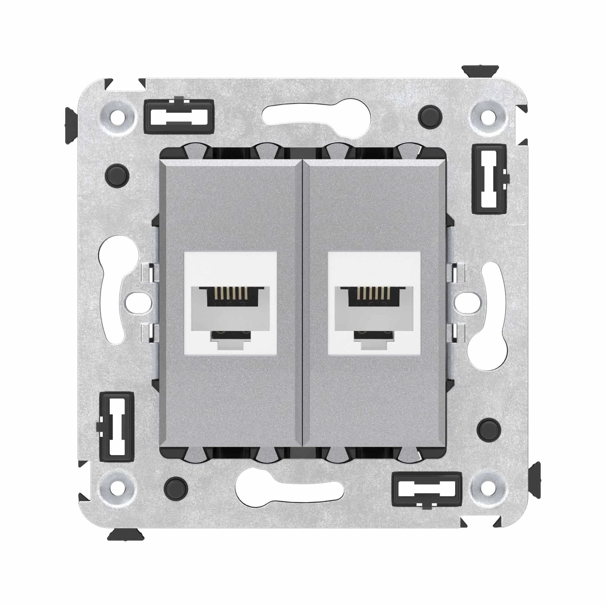 Телефонная розетка RJ-12 двойная без шторки используется для коммутации линий телефонной связи в патч-панелях или для связи телефонных аппаратов с розеткой. Предназначена для скрытого монтажа в стену, поставляется в комплекте с суппортом. Материал – металл, термопласт. Пластиковые детали электроустановочного изделия имеют цвет «Закаленная сталь».