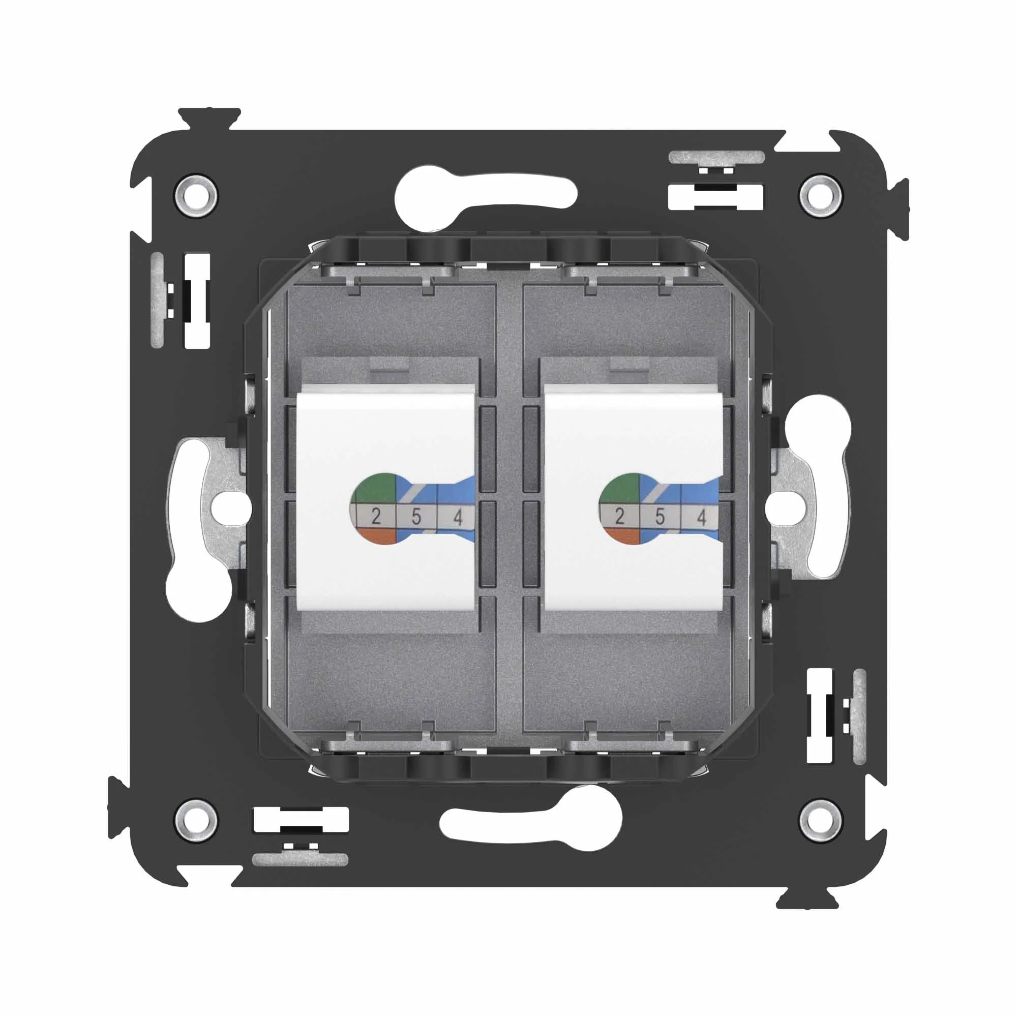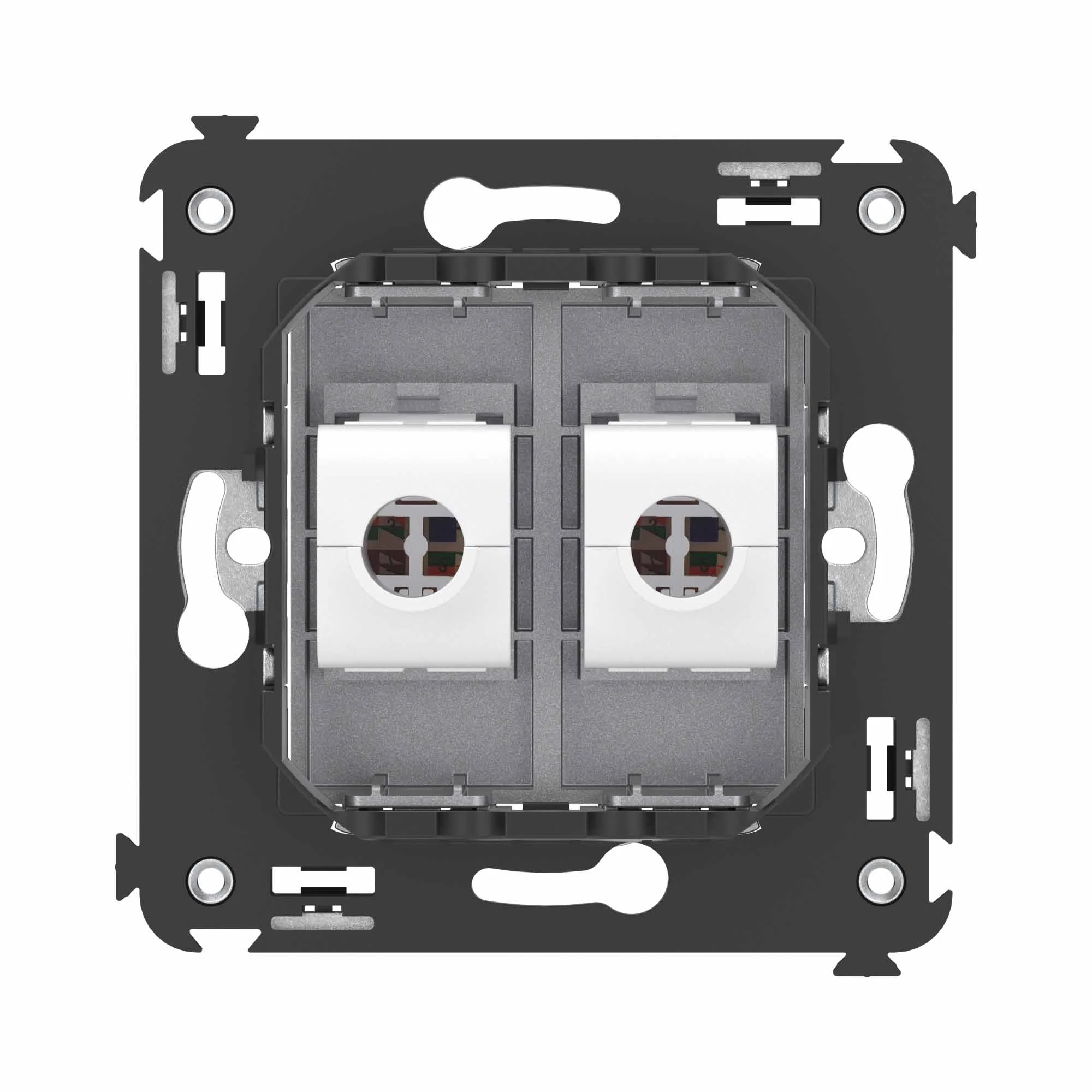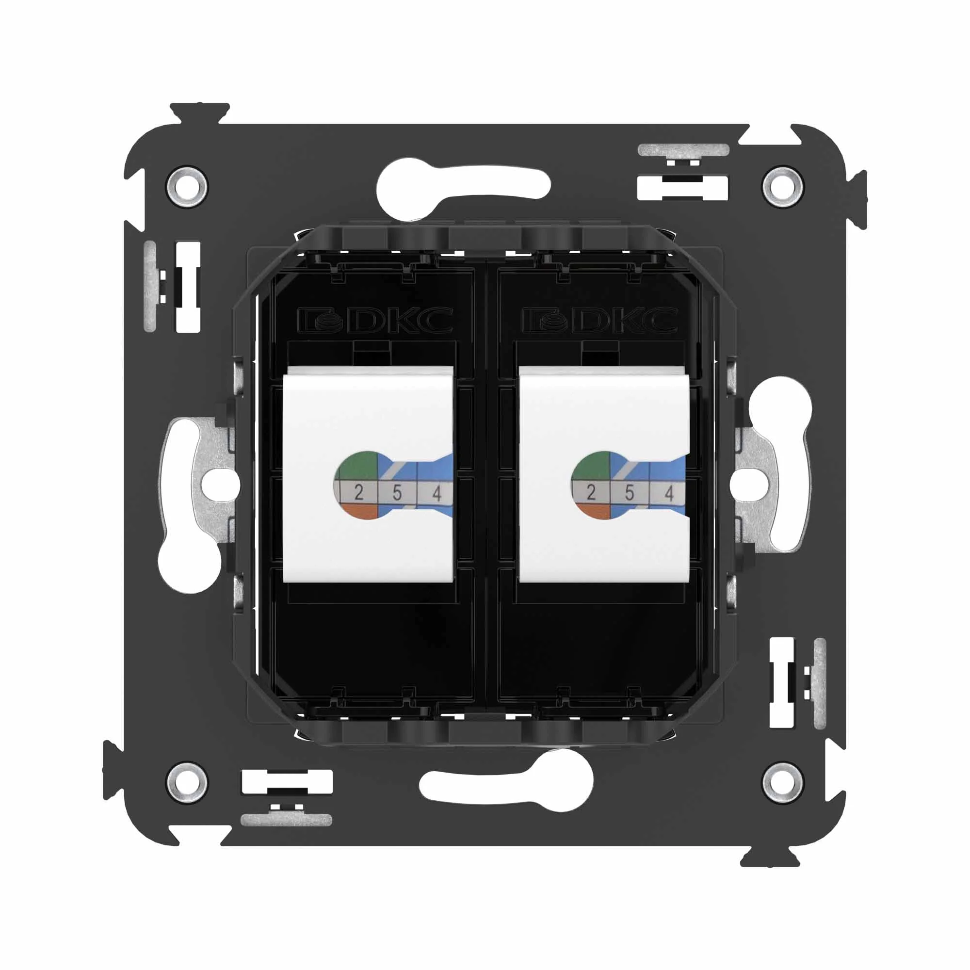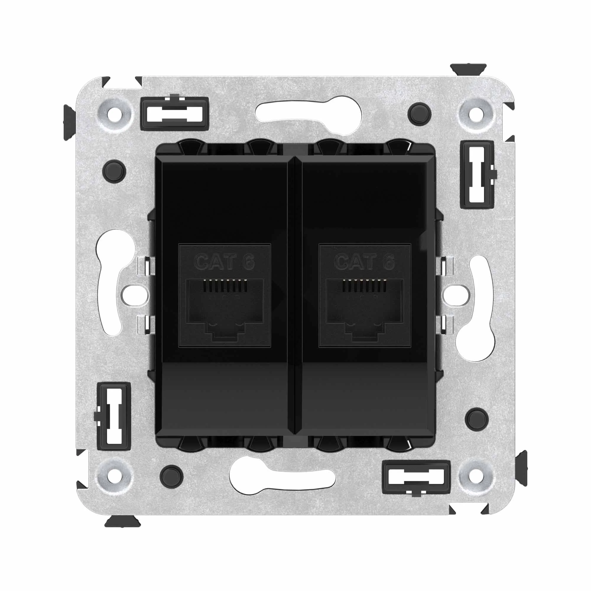 Телефонная розетка RJ-12 двойная без шторки используется для коммутации линий телефонной связи в патч-панелях или для связи телефонных аппаратов с розеткой. Предназначена для скрытого монтажа в стену, поставляется в комплекте с суппортом. Материал – металл, термопласт. Пластиковые детали электроустановочного изделия имеют цвет «Закаленная сталь».