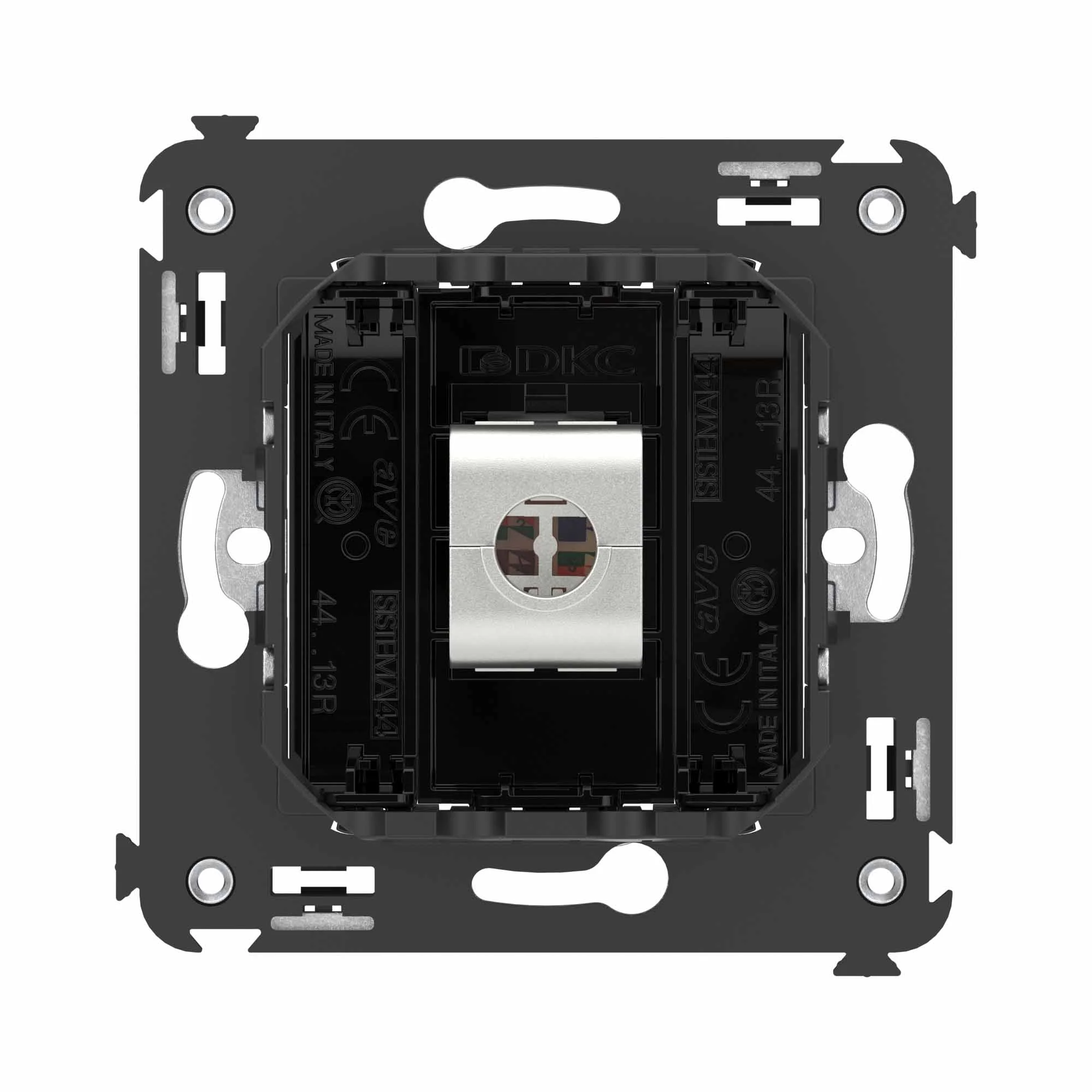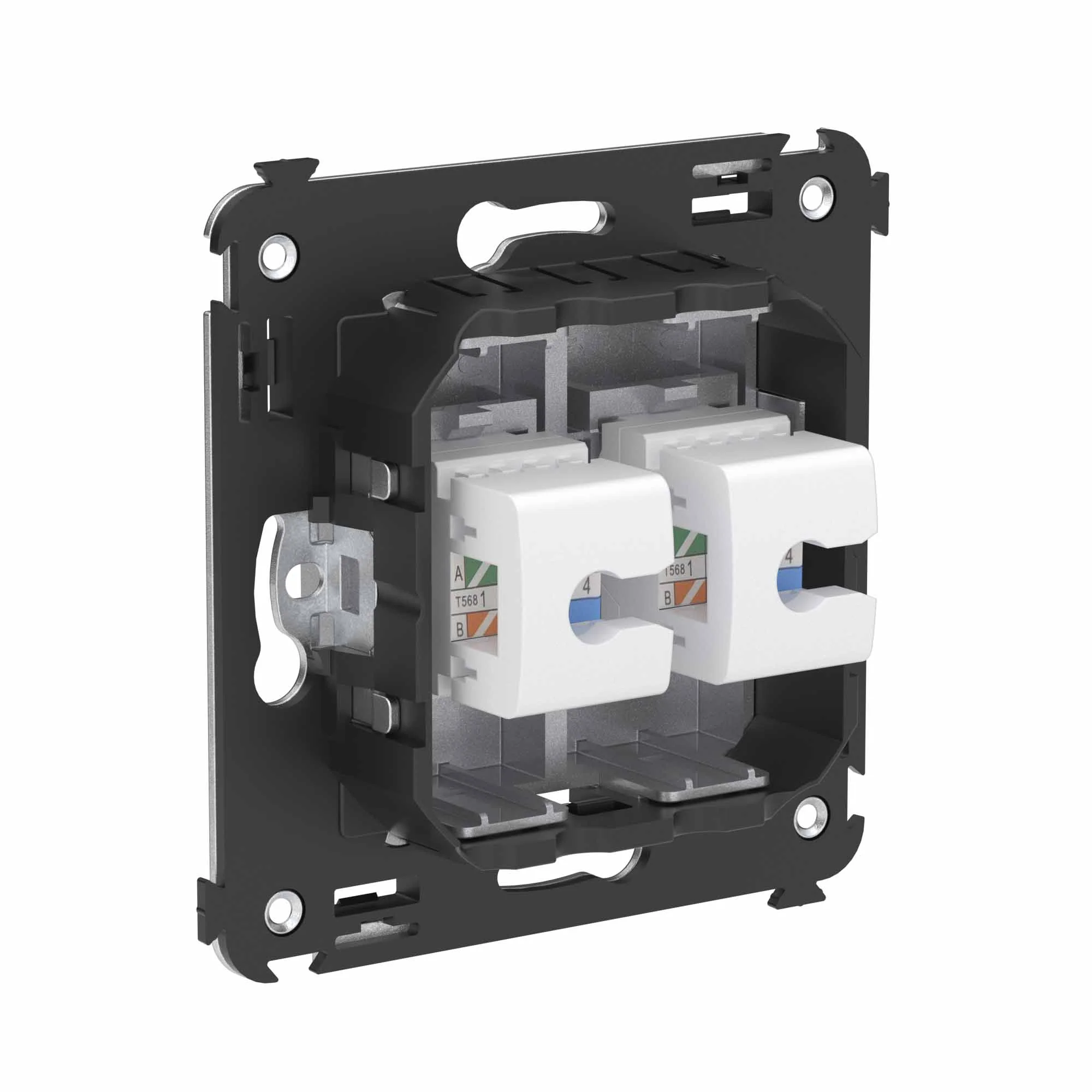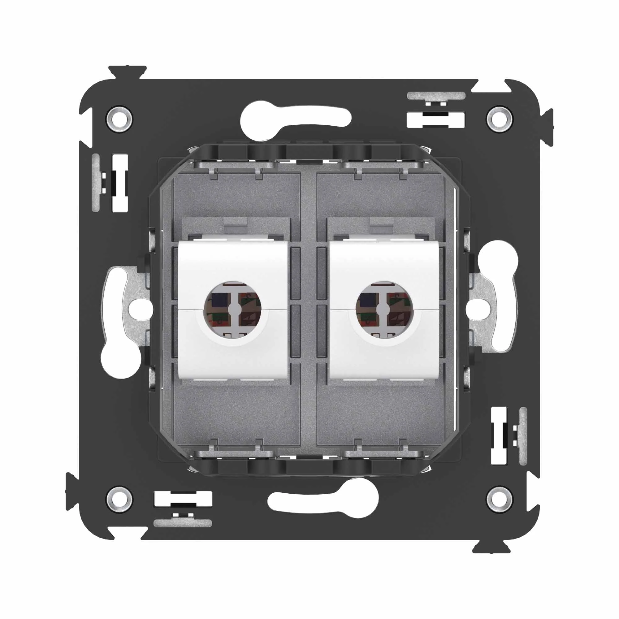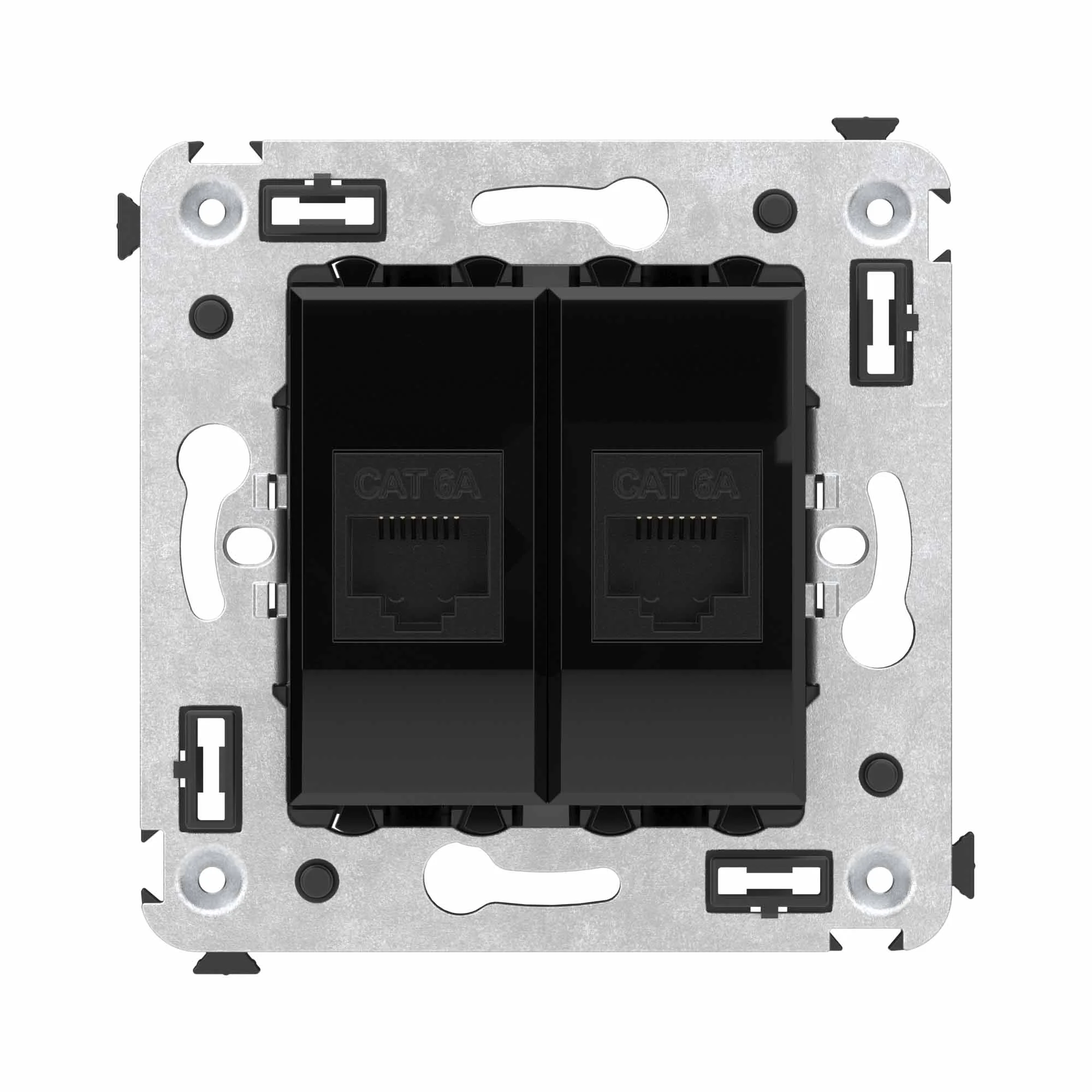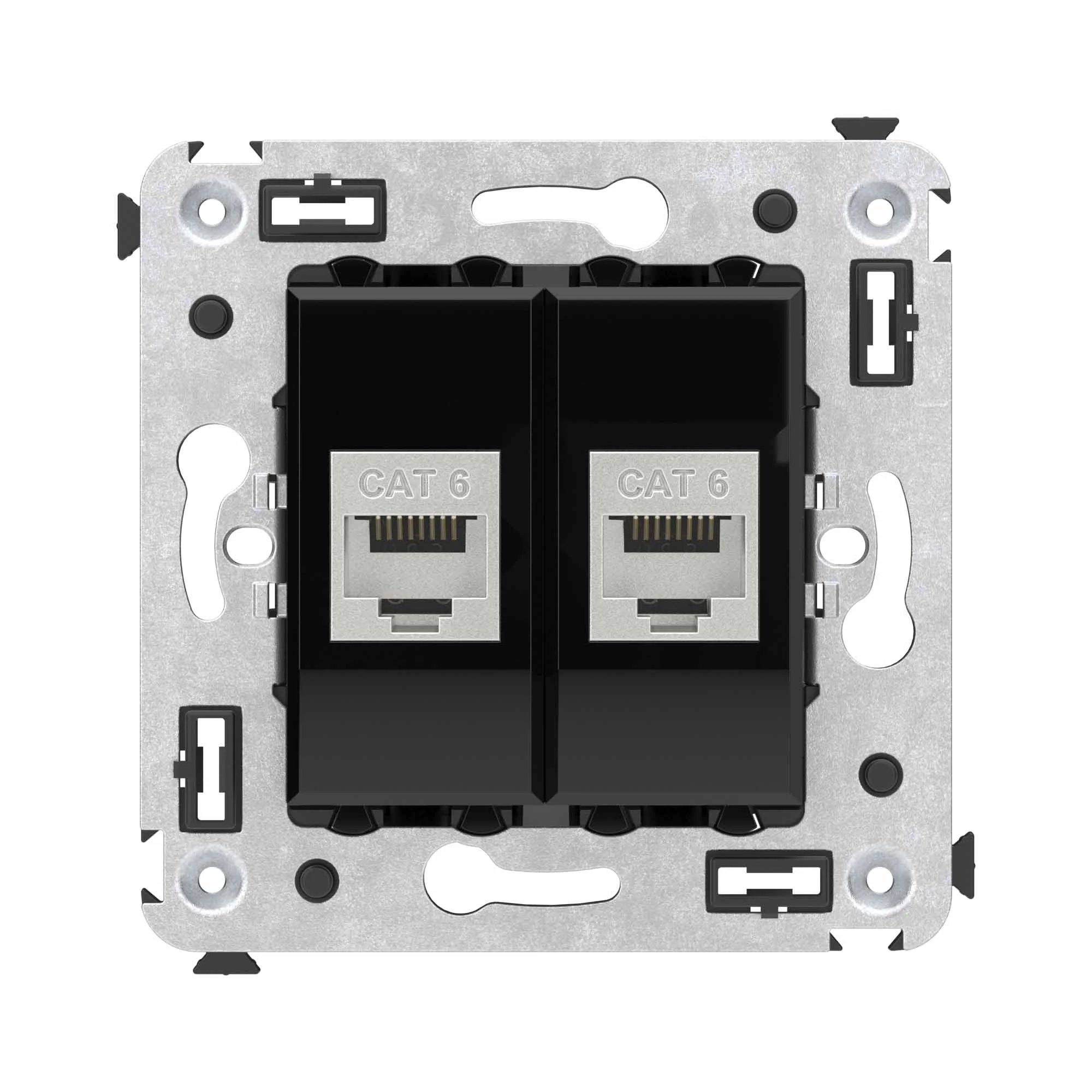 Телефонная розетка RJ-12 двойная без шторки используется для коммутации линий телефонной связи в патч-панелях или для связи телефонных аппаратов с розеткой. Предназначена для скрытого монтажа в стену, поставляется в комплекте с суппортом. Материал – металл, термопласт. Пластиковые детали электроустановочного изделия имеют цвет «Закаленная сталь».